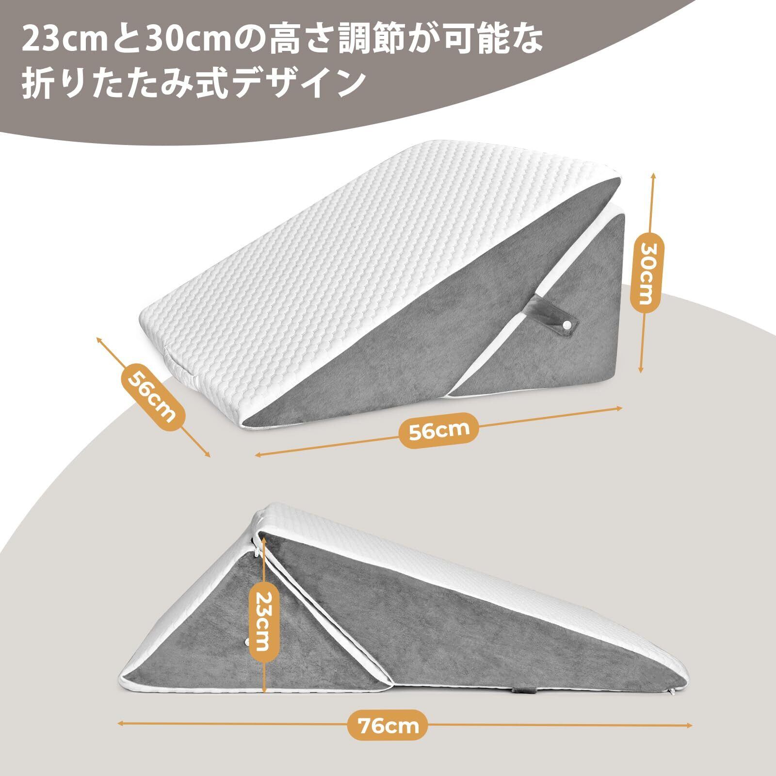 【折りたたみ可能】 広げたサイズ:56*76*23cm、たたんだサイズ:56*56*23*cm。三角クッションは、高さ(23cmと30cm)と角度を簡単に調節でき、仰向けと横向き寝の両方に最適です。折りたたむ位置を変えることで、半座り臥位、低傾斜、高座り臥位に調節できます。高さ調節が簡単で、リラックスや読書、くつろぎ時の姿勢サポートに最適です