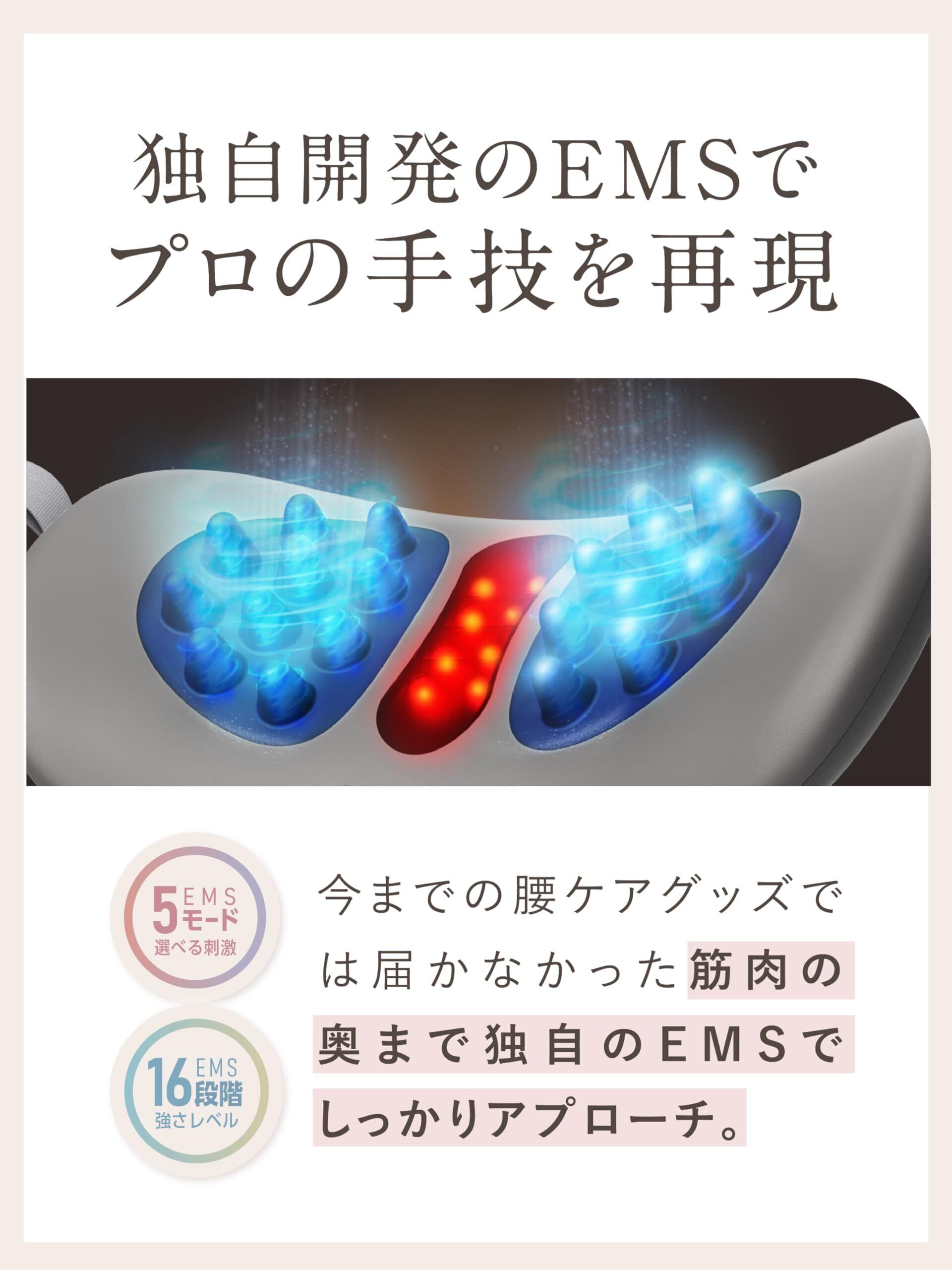 【独自開発のEMSでプロの手技を再現】▶5種類の低周波モード。▶16段階のEMSレベル。今までの腰ケアグッズでは届かなかった筋肉の奥まで独自のEMSでしっかりアプローチします。