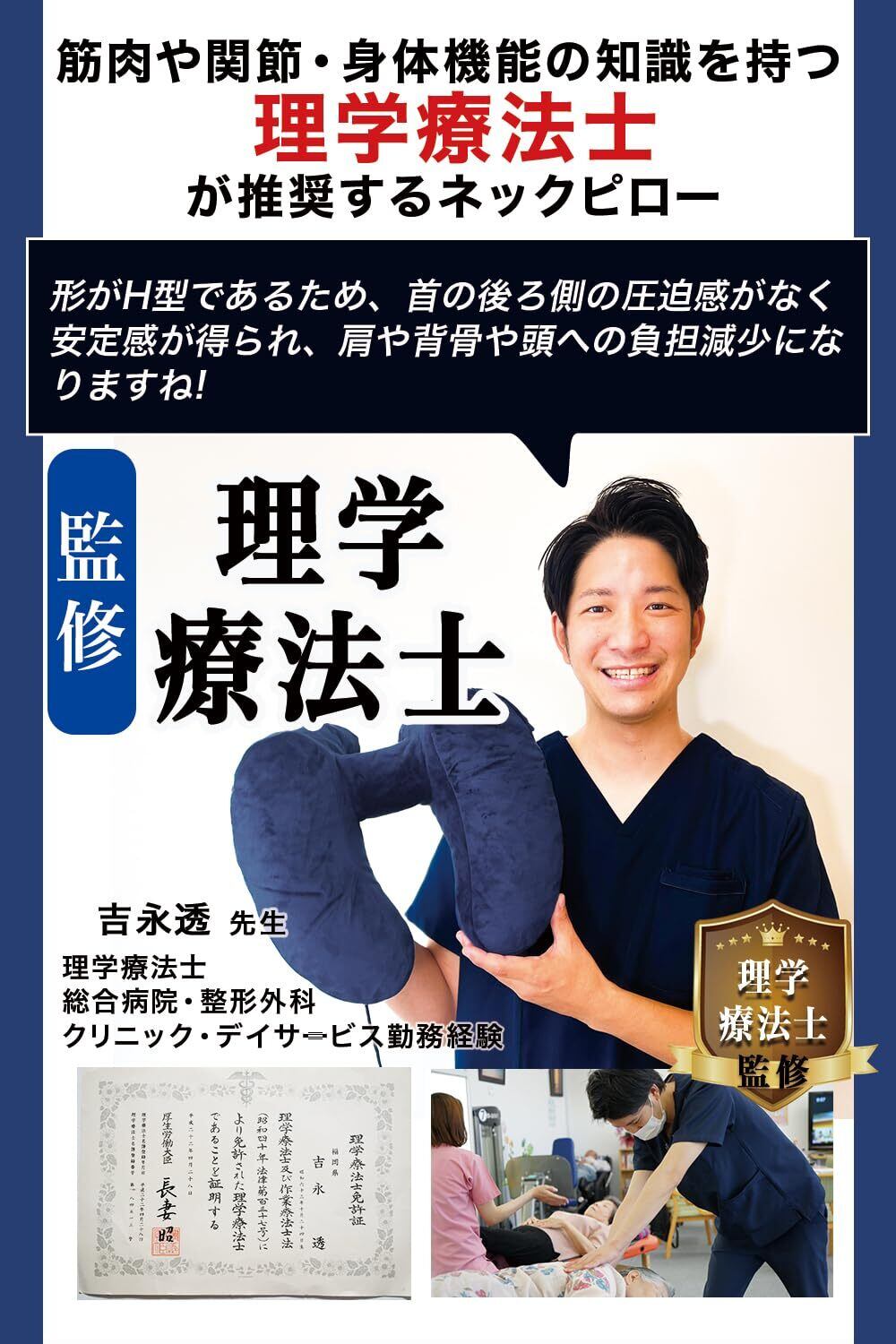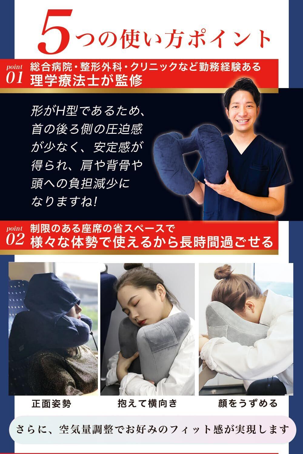 * 【理学療法士監修ネックピロー】筋肉や関節・身体機能の知識を持つ”理学療法士”が推奨するネックピローです。「形がH型であるため、首の後ろ側への負担軽減になりますね!」と手にとってお話ししてくださいました。アゴから耳うしろに向かって立ち上がる形状が、後頭部を支えて、長時間過ごせる自然なポジションにします。※窮屈に感じられる場合は、空気量で調整してください。長時間限られた姿勢で過ごさないといけない移動時に、首だけでなく「抱き枕」「腰用」など様々な使い方ができるのもポイントです。