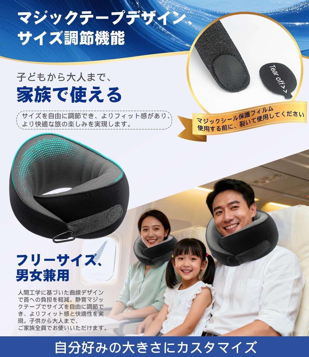 【サイズは自由に調節でき、家族での使用に適しています】静音マジックテープ設計、従来の引きひもとボタンのデザインと比較して、快適性とフィット感が70%向上しました。サイズを自由に調節でき、よりフィット感があり、 、より快適な旅の楽しみを実現します。体型に関わらず、男女問わず使用できます。(マジックシ一ル保顔フイルムて、使用する前に、裂いて使用してください)