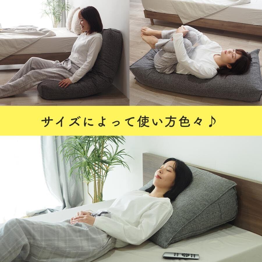 部屋が狭くてソファーは置けないけど、くつろぎスペースは確保したい!方におすすめです。寛大クッションを置くだけで、ベッドがソファーに変身。高さもたっぷりあるので、腰から肩までしっかり支えます。うつぶせ寝も快適座った姿勢はもちろん、横になってリラックスした体勢で、うつぶせでの読書、スマホタイムに◎ そのまま枕にしてお昼寝をしても良し、快適なお休みの日が過ごせそうです。