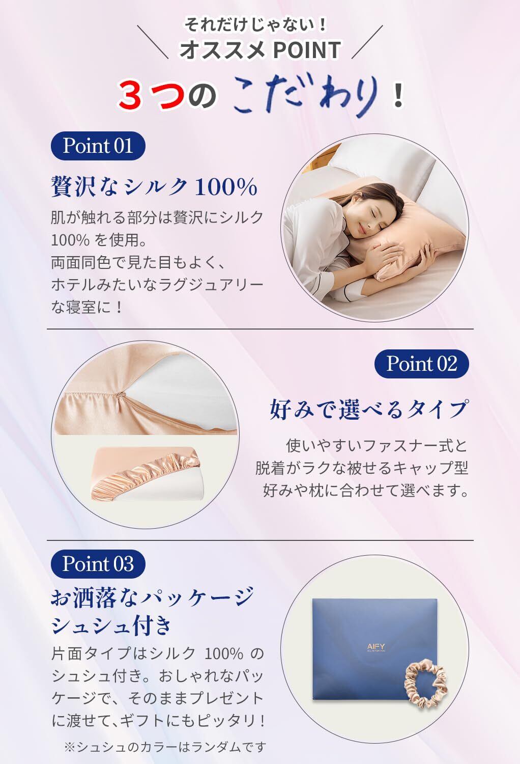 【希少な6Aランクシルク枕カバー】AIFY シルク枕カバーは、片面に希少な6 Aランクのシルクを採用し、もう片面にシルクのような滑らかなサテンを採用しています。シルク枕カバー独特の光沢感で高級感のある一品。100%純粋なマルベリーシルクのなかでも、高品質な6Aランク&19匁の厚みのある生地を厳選しております。天然タンパク質と人肌に極めて近いアミノ酸成分を含んでいるため、敏感な肌の人や赤ちゃん、ご高齢の方でも快適にご利用いただけます。