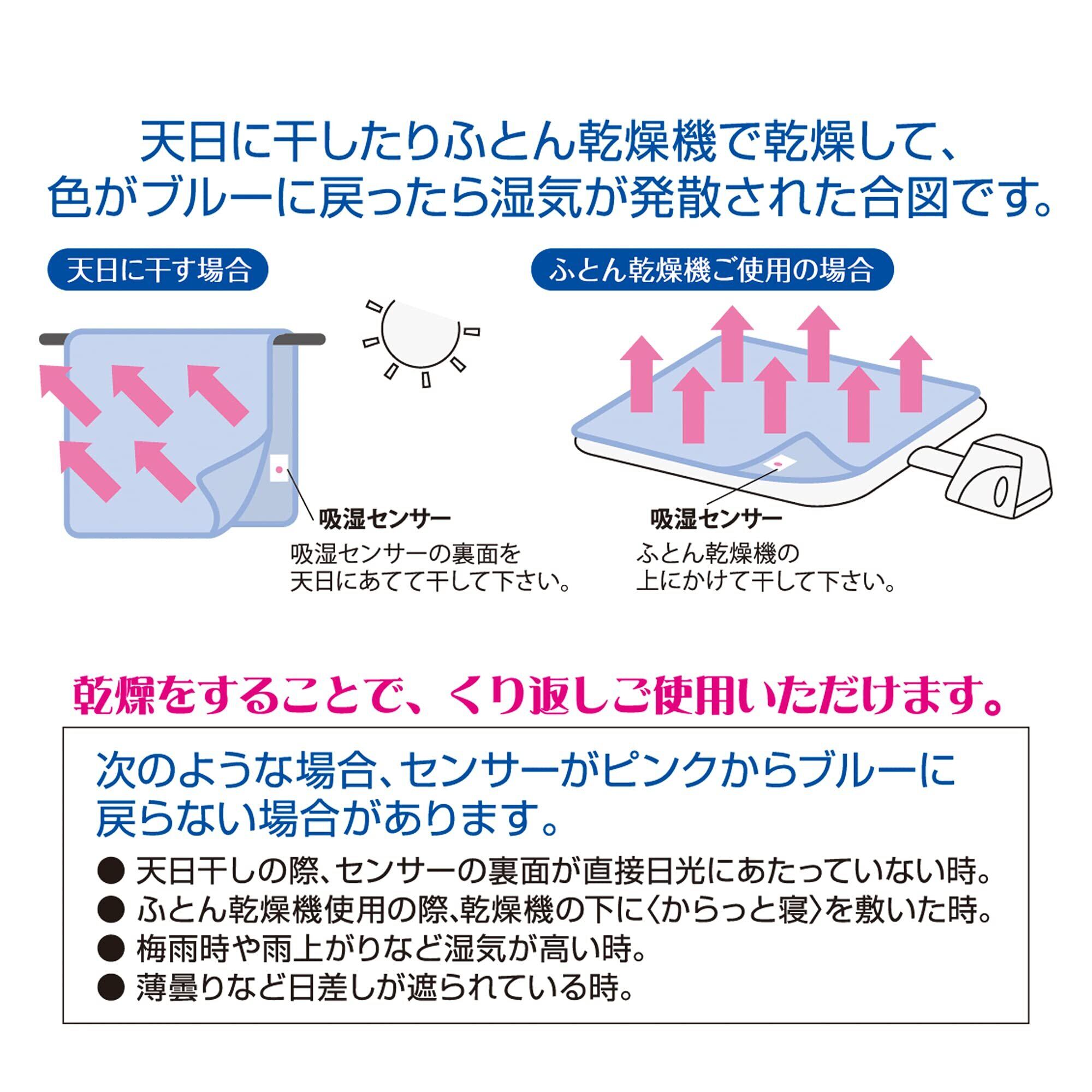 お手入れ簡単! 色が変わってお知らせする吸湿センサー付きなので、センサーの色が変わったら天日に干したり布団乾燥機で乾燥してください。乾燥することで繰り返し使えます。