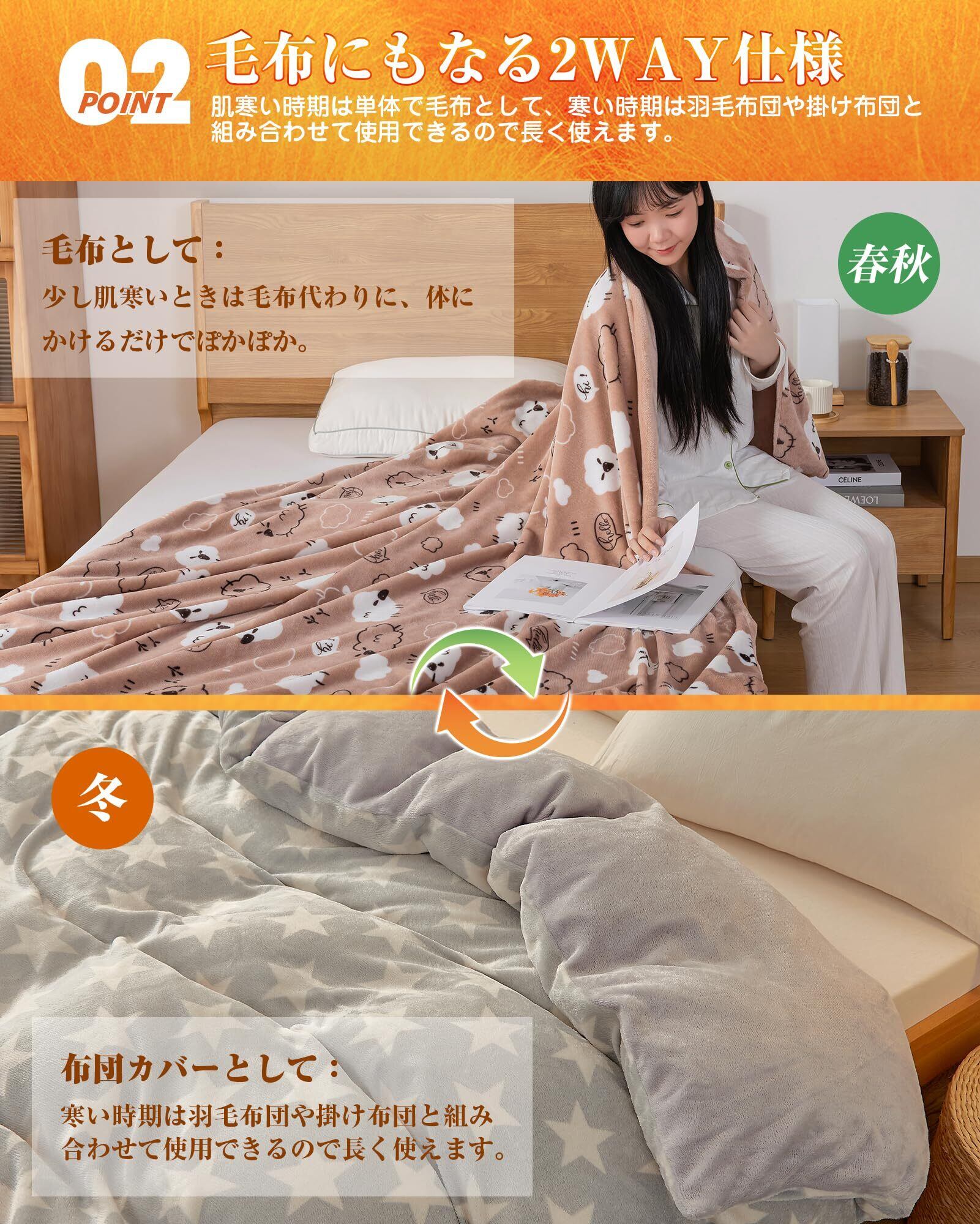 【毛布にもなる2WAY仕様】肌寒い時期は単体で毛布として、寒い時期は羽毛布団や掛け布団と組み合わせて使用できるので長く使えます。季節の変わり目や微妙な温度調節に最適。