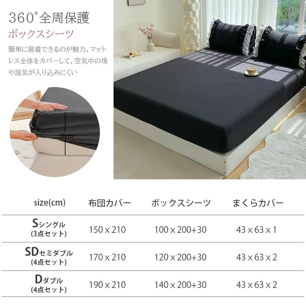 布団カバー 3点セット 2層フリル布団カバー 寝具カバー 洋式・和式兼用 ベッドカバー 掛け布団カバー ボックスシーツ 枕カバー シーツカバー 肌に優しい ピーチスキン加工 北欧風 オールシーズン(シングル、ブラック)