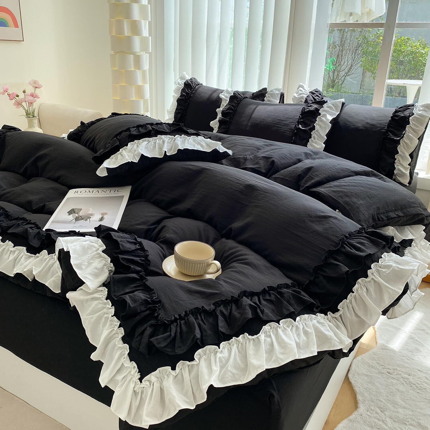 【在庫処分】布団カバー 3点セット 2層フリル布団カバー 寝具カバー 洋式・和式兼用 ベッドカバー 掛け布団カバー ボックスシーツ 枕カバー シーツカバー 肌に優しい ピーチスキン加工 北欧風 オールシーズン(シングル、ブラック)
