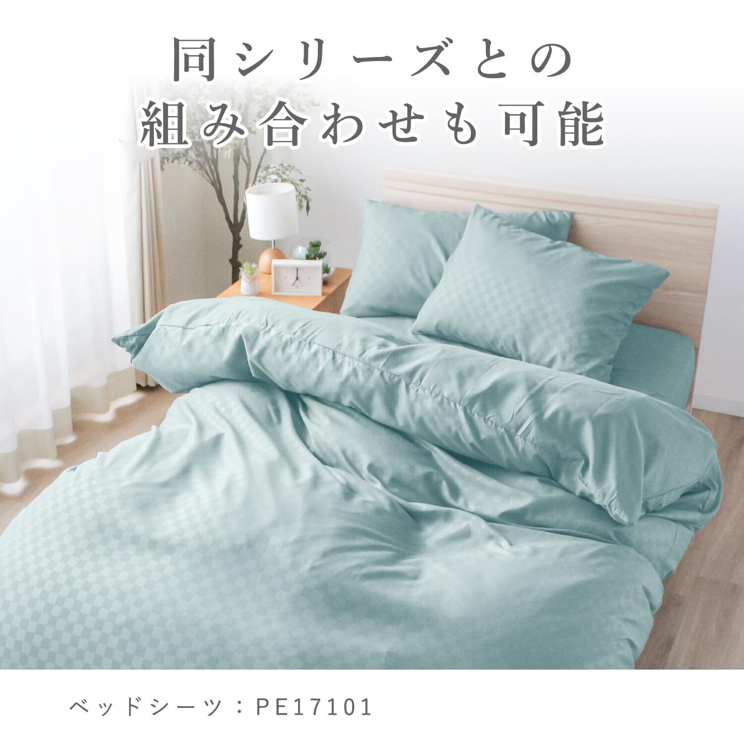 光の加減で市松柄が現れるモダンテイストの布団カバー。一見、無地のカバーにも見える柄が和洋室どちらの部屋にも合わせやすくなっています。