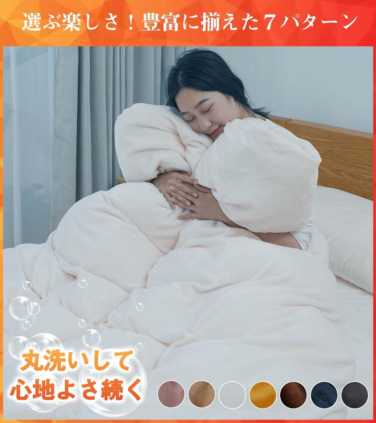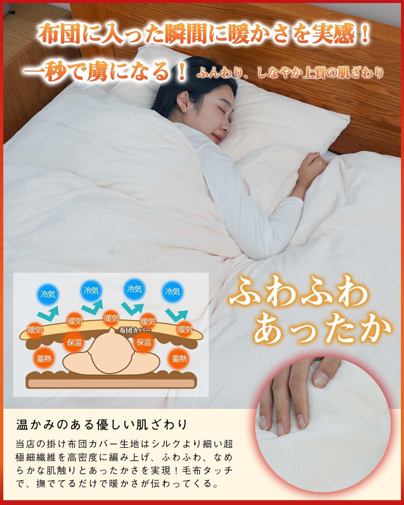 【暖かさが格段にアップ】新企画掛け布団カバー:暖かさが人気のマイクロファイバー繊維を採用。細かい繊維の隙間にたっぷり空気を含むので、身体の熱を保持します。蓄熱保温機能の生地は人体が放出するエネルギーを吸収し、布団内部の温度を上げ、熱を蓄えます。ドレープ性もあり、体に優しくフィットするので、首~肩の部分も隙間ができなく保温性が向上している。さっと布団に被せるだけ、布団にはいった瞬間から、ふわふわの暖かさを感じられます。