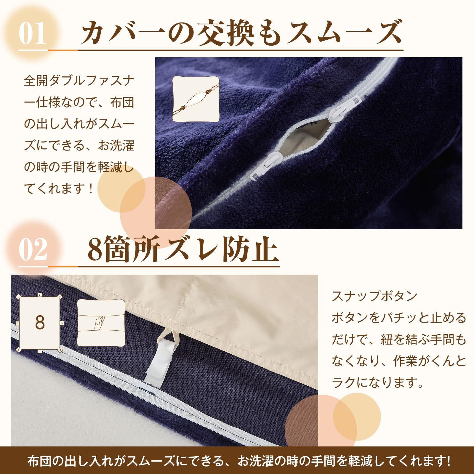 【1枚で2役!季節を問わず大活躍】 冬は温かい掛け布団カバーとして使用でき、布団を外せばふんわり毛布として早変わり。1枚で2通りの使い方ができるため、収納スペースの節約にもなり大変お得です。 8か所に付いたスナップボタンが、布団のズレを防いで快適な寝心地をキープし、全開ファスナーにより簡単に布団の出し入れが可能。 季節の変わり目や洗濯時にもサッと着脱できる、便利な設計です。