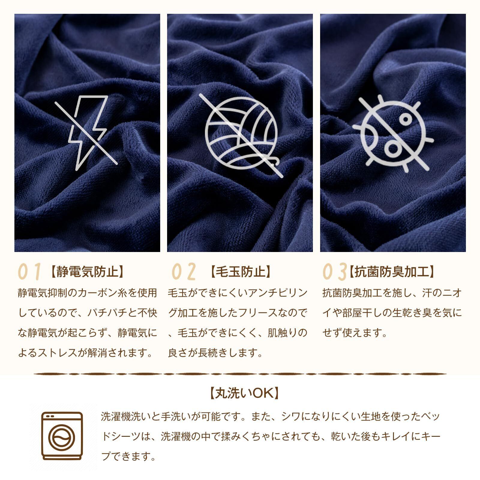 【静電気防止加工&丸洗いOK】不快なパチパチ感を和らげるため、毛玉ができにくいアンチピリング加工を施したフリースなので、毛玉ができにくく、肌触りの良さが長続きします。起毛させた生地は、布団本体との摩擦でどうしても毛玉ができてしまいます。現段階では、「毛玉ゼロ」はありえません。少しでも毛玉を軽減する対策として、月2回のお洗濯をおすすめ致します。お洗濯の際は表・裏を交互に洗ってください。