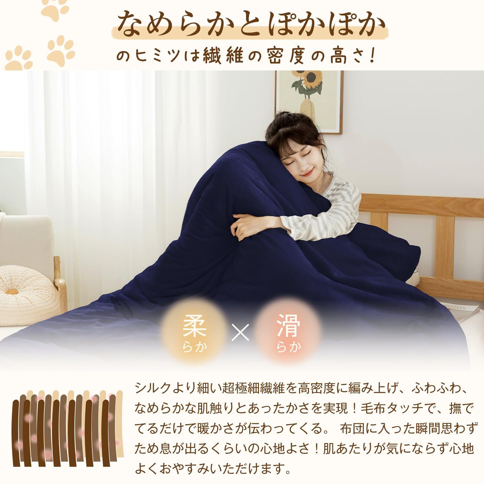 【なめらかな肌ざわり・超極細繊維】この掛け布団カバー生地はシルクより細い超極細繊維を高密度に編み上げ、ふわふわ、なめらかな肌触りとあったかさを実現!毛布タッチで、撫でてるだけで暖かさが伝わってくる。布団に入った瞬間思わずため息が出るくらいの心地よさ!肌あたりが気にならず心地よくおやすみいただけます。