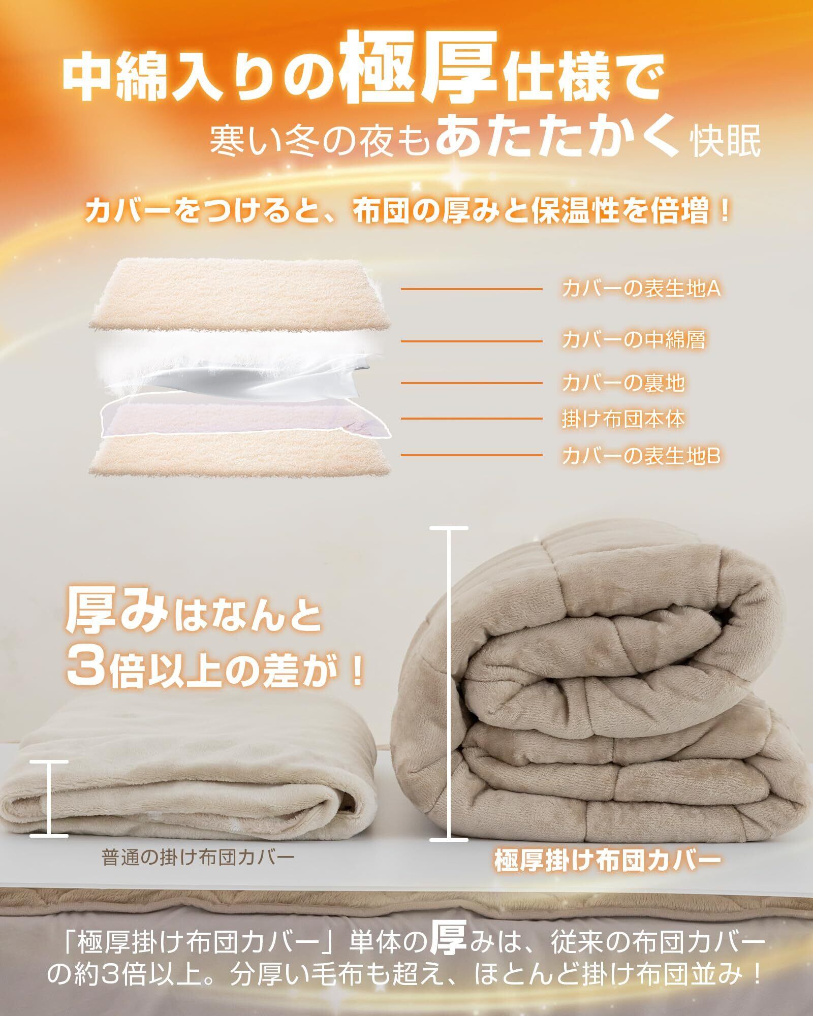 【中綿入り極厚掛け布団カバー】保温・蓄熱性に優れた中綿をたっぷり使用、厚みは通常のカバーの3倍以上、一般的な毛布の2倍以上、優れた保温力が実現できる。どんな布団でも、カバーをつけるだけでふっくら暖かくなります。