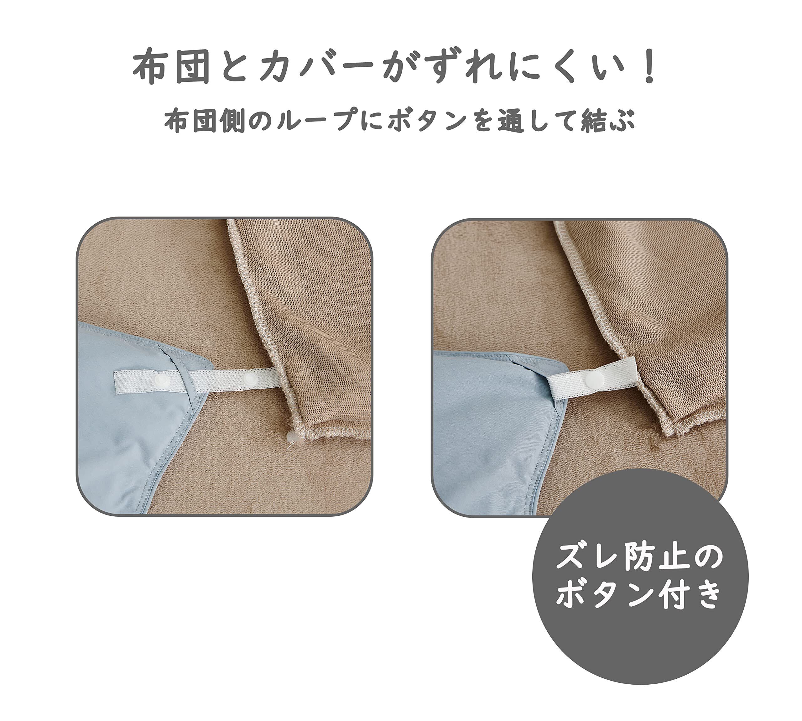 【生地】:ポリエステル100%、フランネルで毛布タッチの掛け布団カバー。表面の起毛が、手で触るともふもふ感があり、ふんわりしています。繊維間の密度がとても高く柔らかいのが特徴です。また、程よく暖かい空気を含んでくれますので、布団へ入った瞬間に暖かく感じます。毛玉になりにくいので、耐久性が高く、長時間使用しても問題ありません。