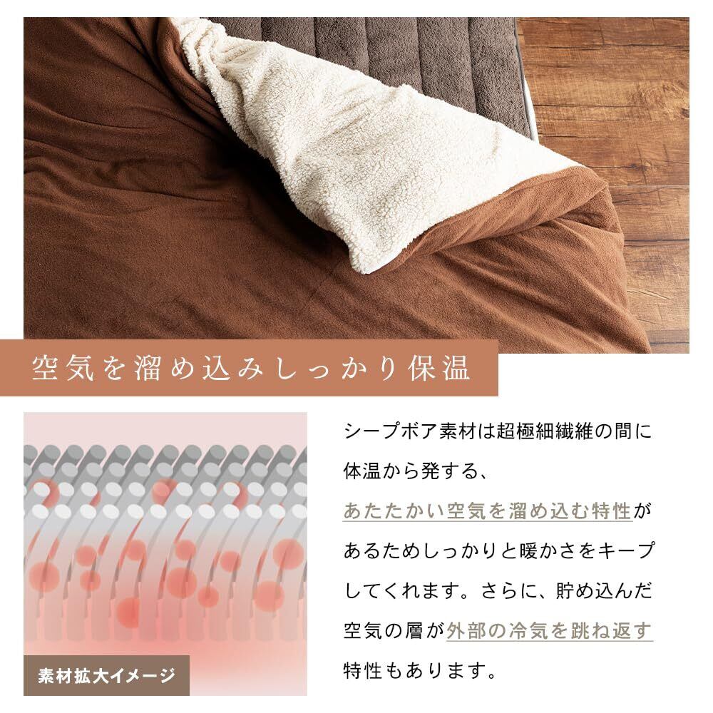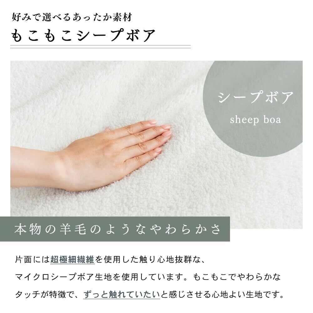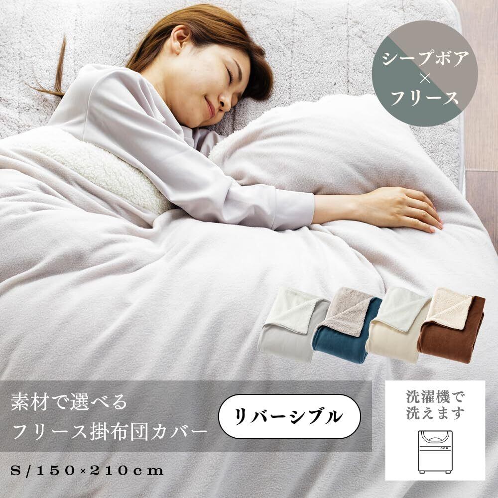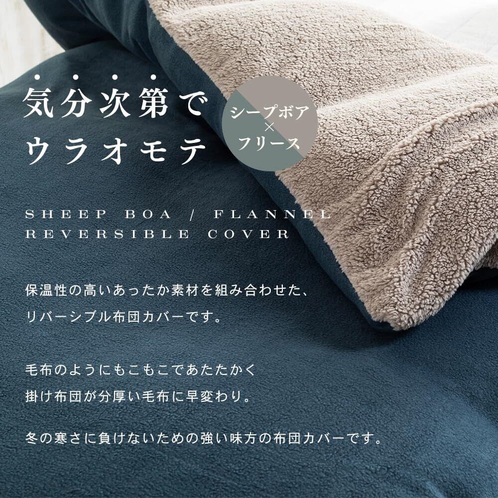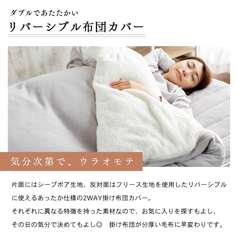 掛布団がもこもこ毛布に変身、毛布要らずの掛布団カバーです。片面の生地には保温性が高く肌触りが柔らかな『フリース』生地を採用、もう片面にはもこもこでまるでヒツジの毛のような『シープボア』生地を採用しています。お手持ちの掛布団にカバーを付ければあったかフリース毛布に早変わり。リバーシブル仕様なので表裏お好みの生地、カラーを選んで頂きお部屋を演出してください! カバーの内側に布団と固定するヒモが6カ所付いています。