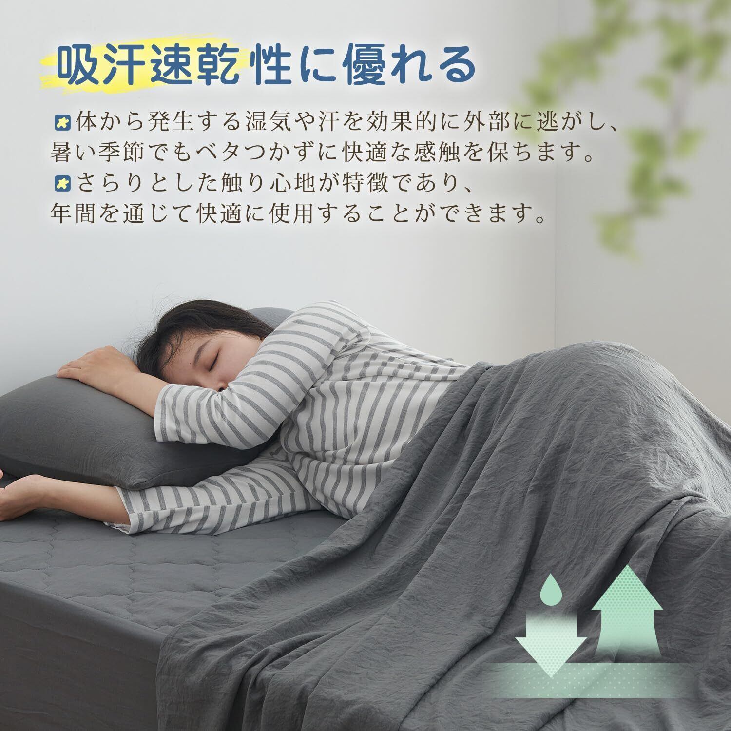 「通気性と速乾性」:通気性が高いため、シーツの中で湿気がこもりにくく、快適な寝心地を提供してくれます。また、このシーツは中綿が入っているにも関わらず、速乾性に優れています。洗濯後に素早く乾くため、いつも清潔な寝場所を保ちます。