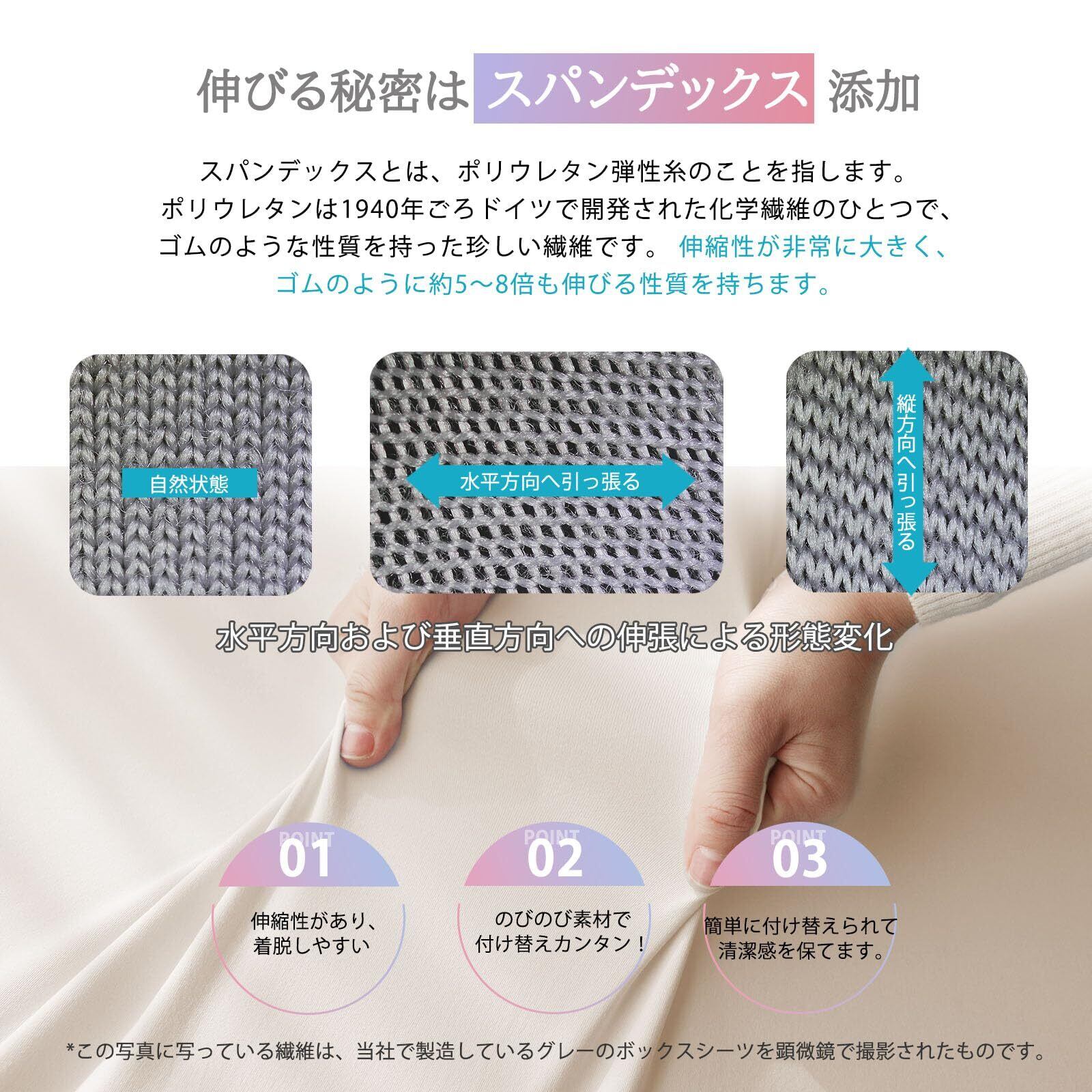 【伸縮性抜群・適用幅広い】『3Dストレッチ』特性を持ち、タテにもヨコにも伸びるので、マット適用サイズ幅広いです。畳の敷き布団・洋式マットレスまで幅広く対応。アイロンせずシワ一つもない、きれいなベッドに変身できるボックスシーツです。