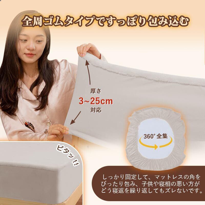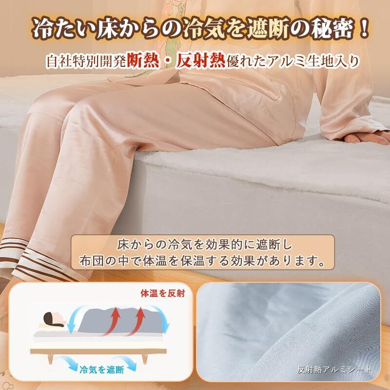 【音しないアルミピーチ・優れた断熱性】ボックスシーツの裏に熱を逃がしにくく外気の冷たい空気の侵入を防ぐアルミシートが使用、冷気を断熱する新開発素材です。ガサガサ音しない加工がしました。暖かい空気をたくさんロック、その熱を保温し、自然な暖かさがやさしく体を包んでくれるベッドシーツです。