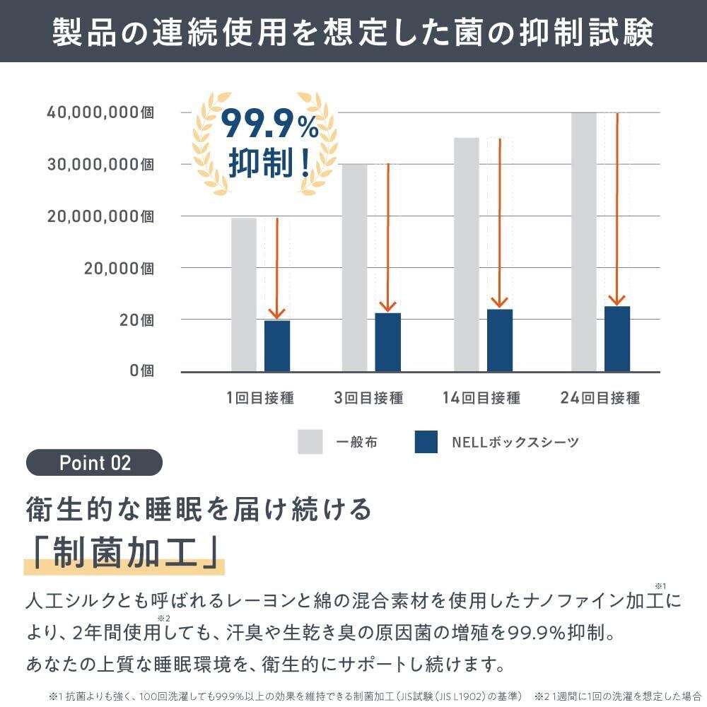 [ 衛生的な睡眠を届け続ける「制菌加工」]ナノファイン加工※1により、汗臭や生乾き臭の原因菌の増殖を99.9%抑制。あなたの上質な睡眠環境を、衛生的にサポートし続けます。※1抗菌よりも強く、100回洗濯しても99.9%以上の効果を維持できる制菌加工(JIS試験(JIS L1902)の基準)
