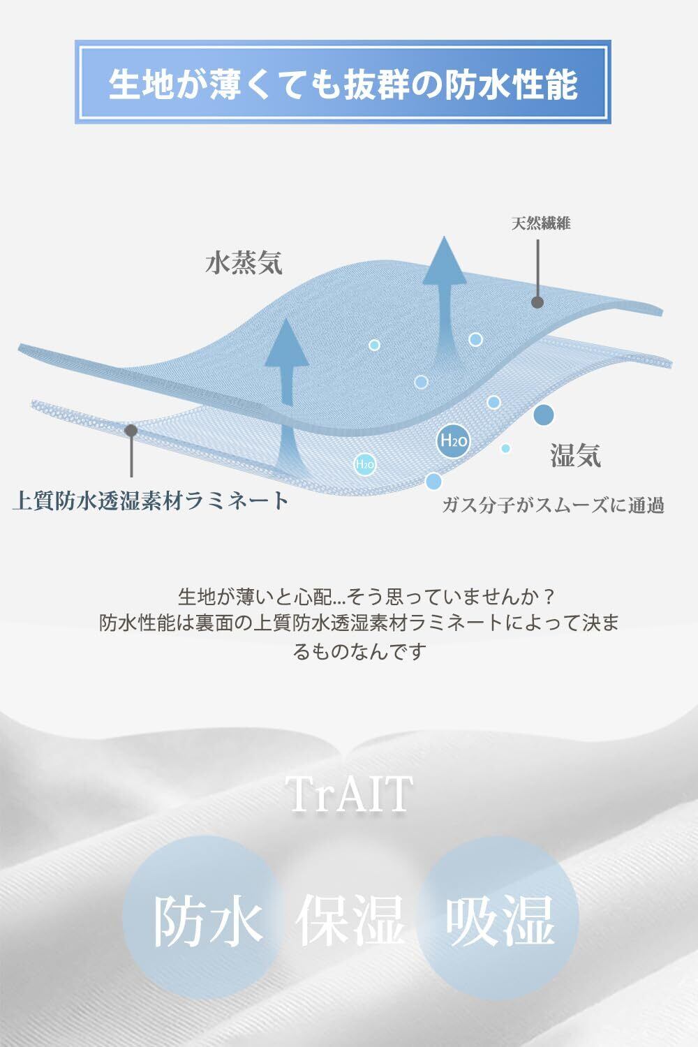 【100% 完全防水】Aookaボックスシーツ防水の裏面にはメンプレン(上質防水透湿素材ラミネート)になってて、ポリウレタンをコーディングし、防水性を高めました。側面でも完全防水です、横漏れした水分の染み込みを防ぎます。マットレスカバー 防水はシワになりにくく、360°伸縮性あり、厚さは30cmまで対応なので、着脱簡単です!介護用やおねしょはもちろん、敷布団やマットレスへの浸水、汚れなどをしっかり防いでくれます。介護用防水シーツは子供との添い寝やペットと一緒に寝る時に大活躍しています、寝相を気にすることなく朝までぐっすり!