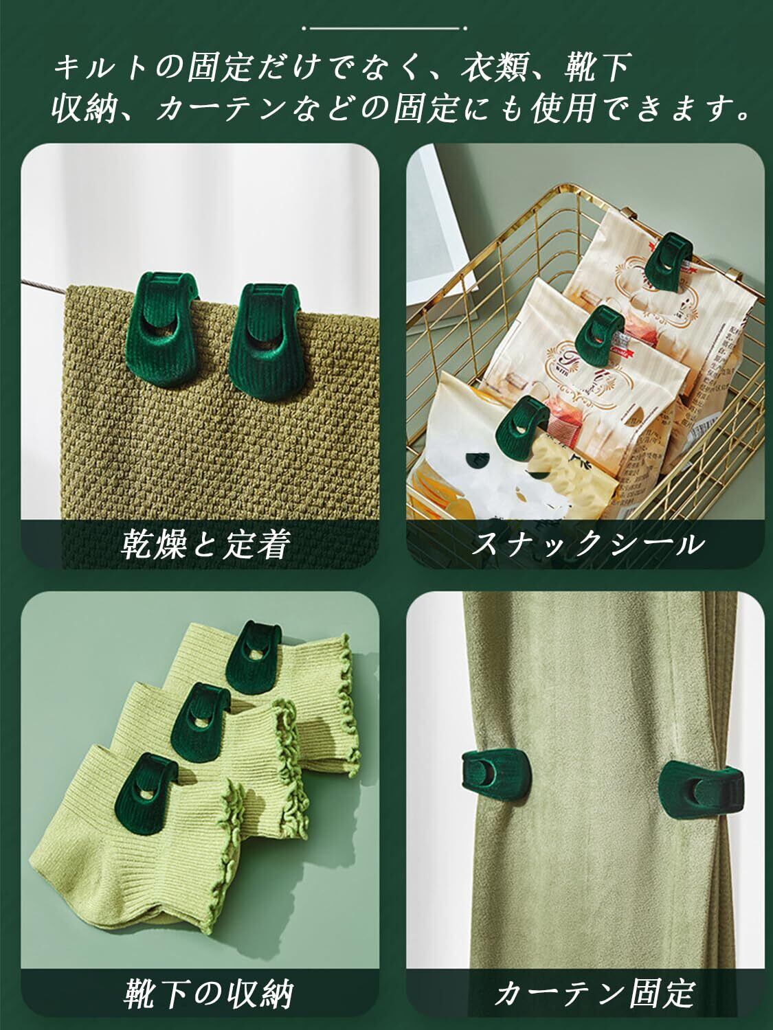 【幅広い用途】羽毛掛け布団、厚手の掛け布団、厚手の掛け布団、厚手の掛け布団カバー、厚い掛け布団カバーを収納できるだけでなく、当社のキルトクリップは他のほとんどの場面で使用できます。 例えば、カーテンを固定したり、風で飛ばされるのを防いだり、靴下などの小物を収納したりすることができます。 これにより、家庭環境がより整頓されます。