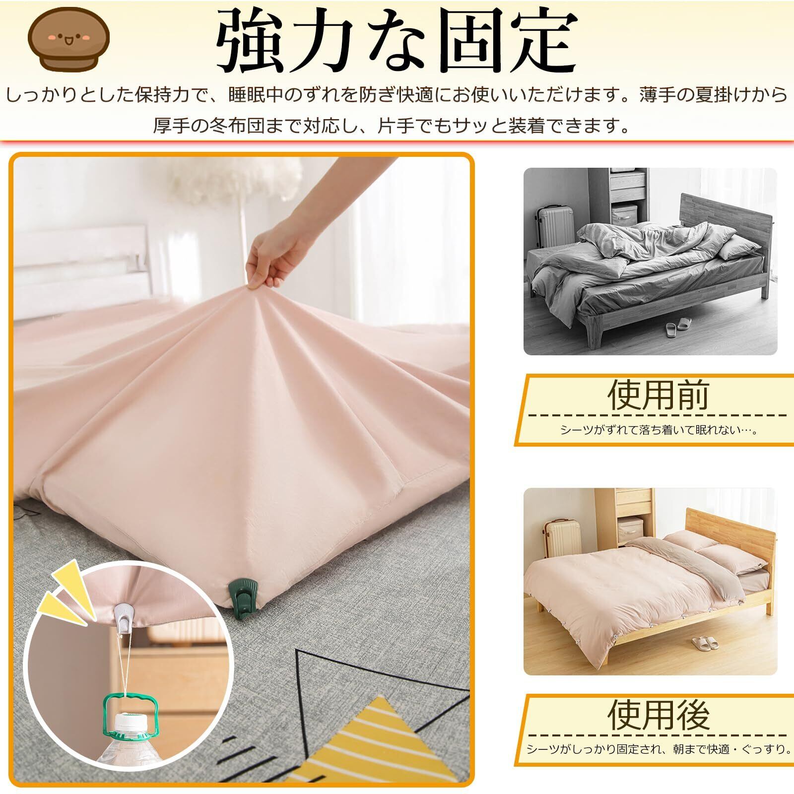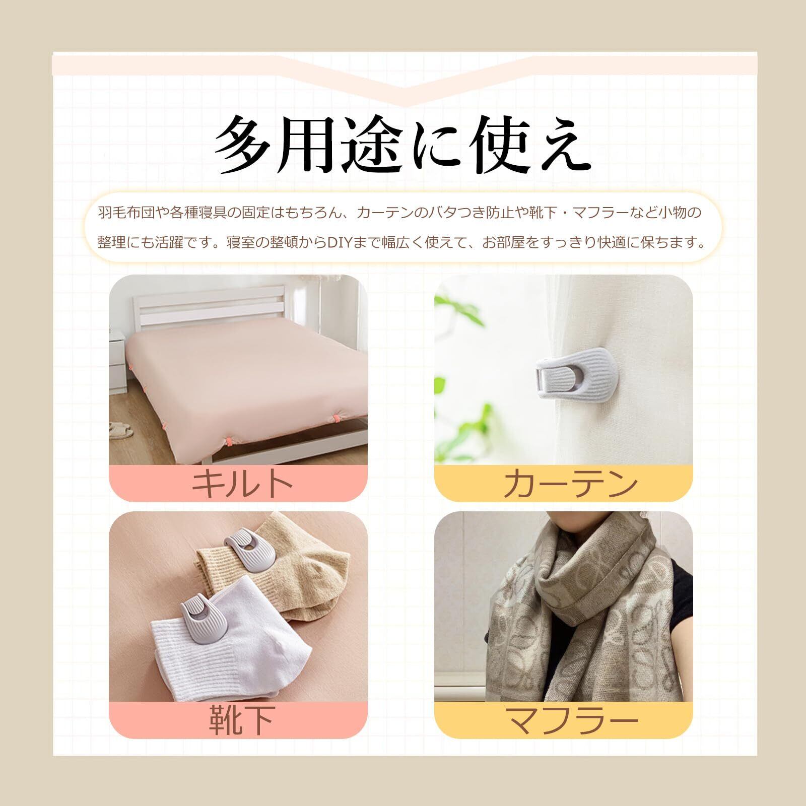 【多用途に使える】多用途で使える布団固定器です。羽毛布団や各種寝具の固定はもちろん、カーテンのバタつき防止や靴下・マフラーなど小物の整理にも活躍です。さまざまな日用品に対応し、寝室の整頓からDIYまで幅広く使えて、お部屋をすっきり快適に保ちます。