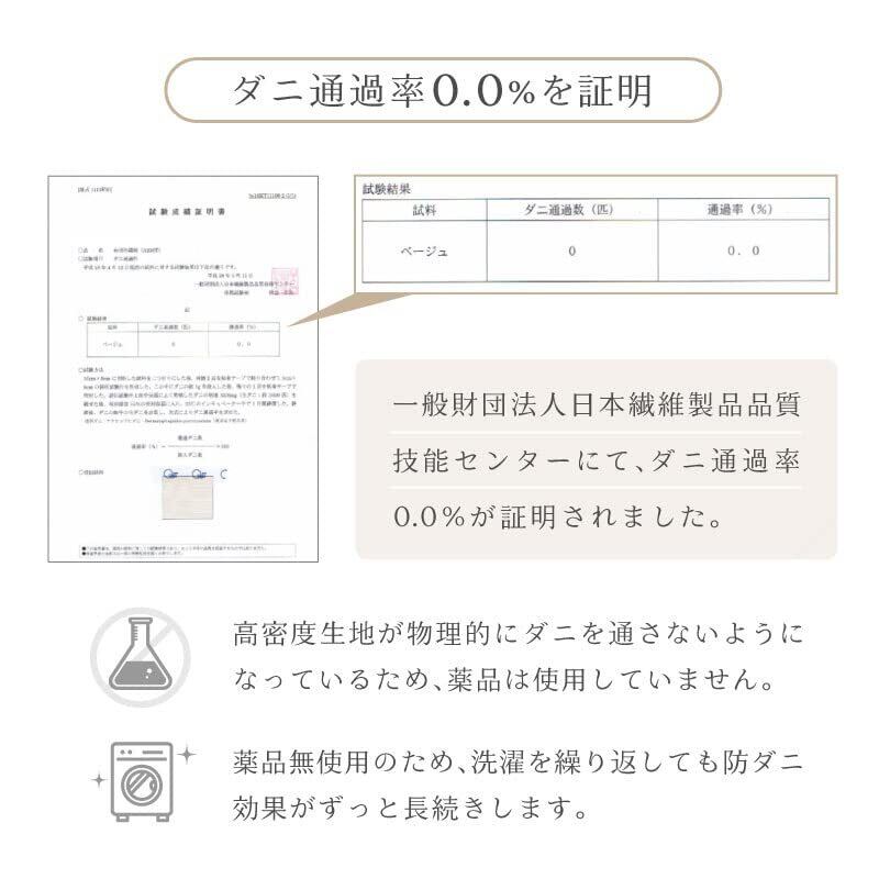 ダニが通過できない高密度の生地 薬剤を使うことなくダニを防ぎます 全開ファスナーで出し入れ簡単!! 凸凹の少ない生地でダニや花粉、ホコリの付着を防止。 手でサラッとはらえるほどにサラサラ。 吸水速乾でいつでもサラッとしているから カビやダニを繁殖させない!! お洗濯後の乾きも早いのでお手入れ簡単!! 洗濯を繰り返しても、防ダニ効果は落ちません。 静電気防止機能があるので静電気が起きにくい生地です。 肌にあたる生地は、なめらかな肌触りのピーチスキン加工なので快適にお休みいただけます。 色も「ホワイト」「グレー」「ネイビー」「ハニーベージュ」「ブラウン」 お好きな色をお選びください。