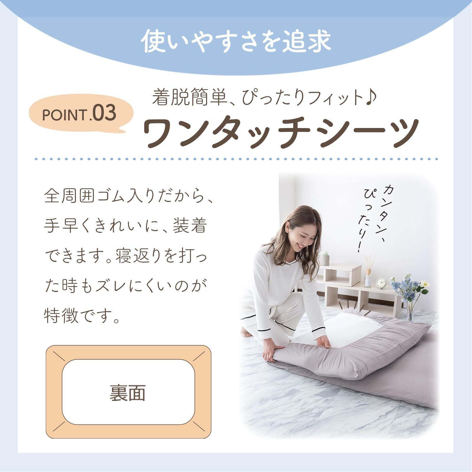 【シーツの付け替え簡単】全周ゴム入りだから手早くきれいに、装着できます。寝返りを打った時もズレにくいのが特徴です。
