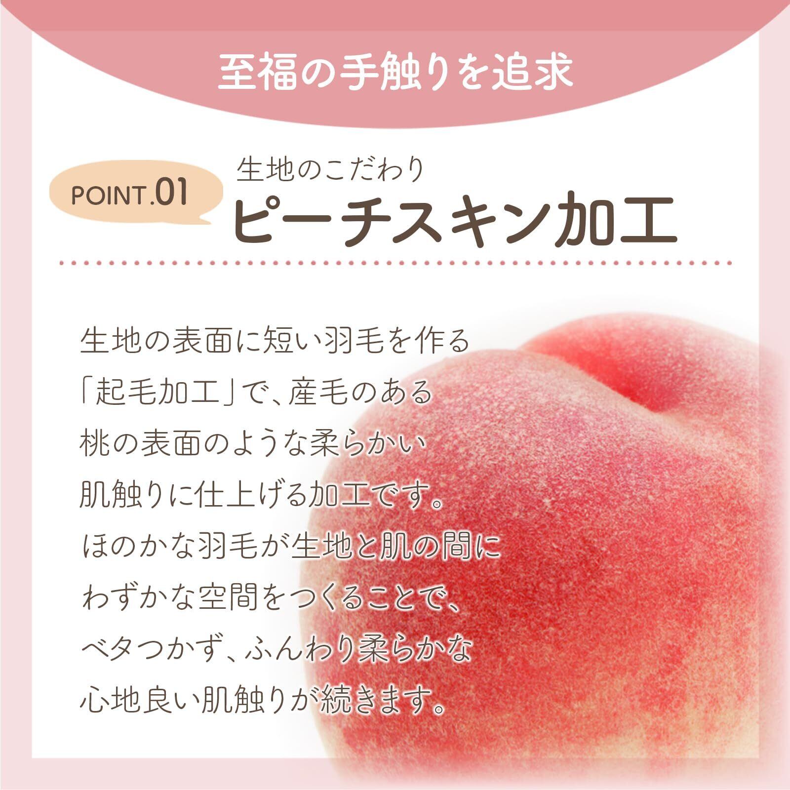 【肌触りの良いピーチスキン加工】生地の表面に短い毛羽を作る起毛加工で、産毛のある桃の表面のようなやわらかい肌触りに仕上げる加工です。ほのかな産毛が生地と肌の間にわずかな空間を作ることで、べたつかず、ふんわりやわらかな心地よい肌触りが続きます。
