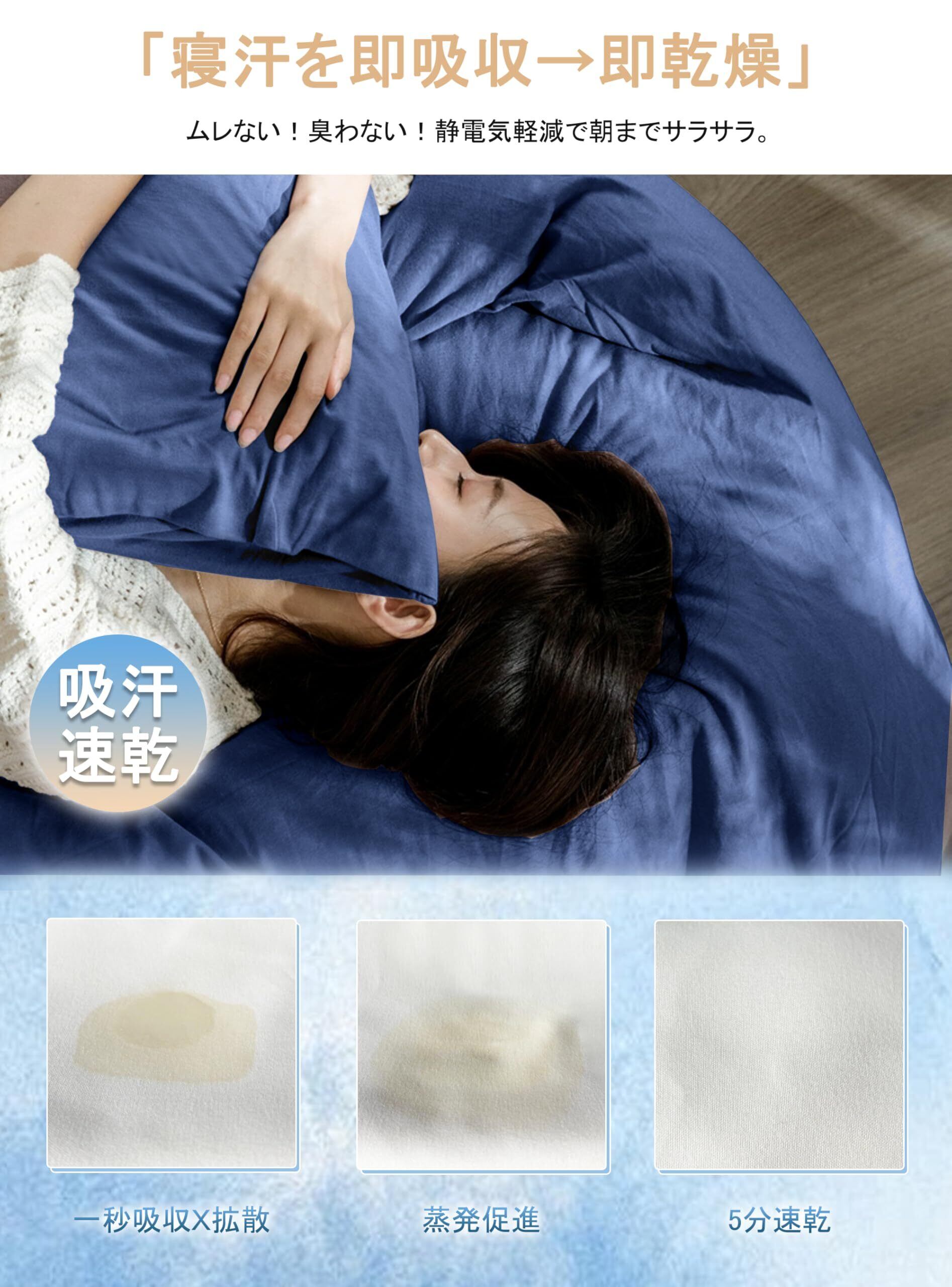 【吸湿速乾|汗や湿気をサラッと快適】吸湿性に優れたポリエステル繊維が寝汗を素早く吸収し、洗濯後は即日乾燥可能。夏は涼しく、冬は適度な保温性でオールシーズン快適にご使用可能。抗菌防臭性能もあり、汗や皮脂による雑菌繁殖・ニオイを抑制。