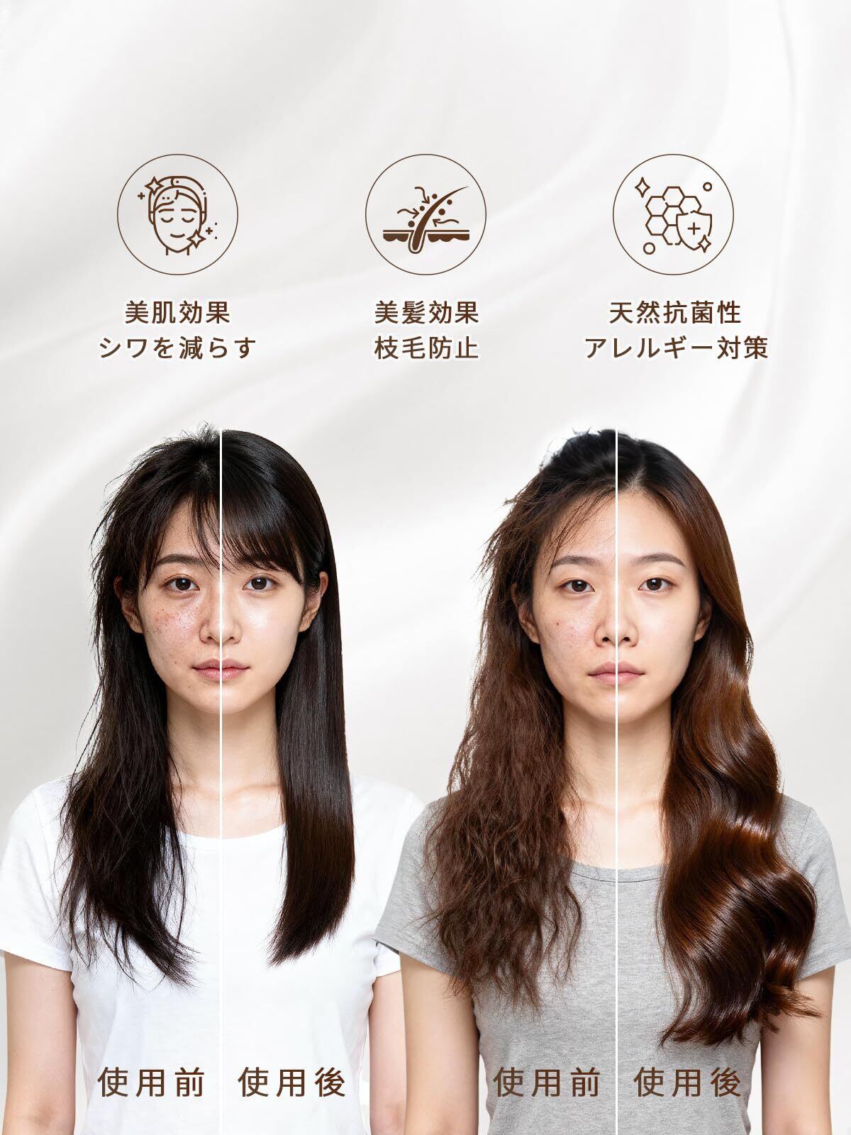 美髪・美肌:シルクは、摩擦を軽減し、肌に潤いを与える優れた素材として、近年美容界で注目を集めています。 シルクの表面は滑らかなので摩擦が起こりにくく、切れ毛・枝毛の悩みも改善できます。 シルクの枕カバーは純綿の枕カバーより通気性に優れています。肌の水分を調節し、肌に栄養を与えます。シルクも、ダニやカビの繁殖を防ぎ、皮膚アレルギーを防ぐことができます。綿と比較して、シルクの枕カバーが最適な選択です!
