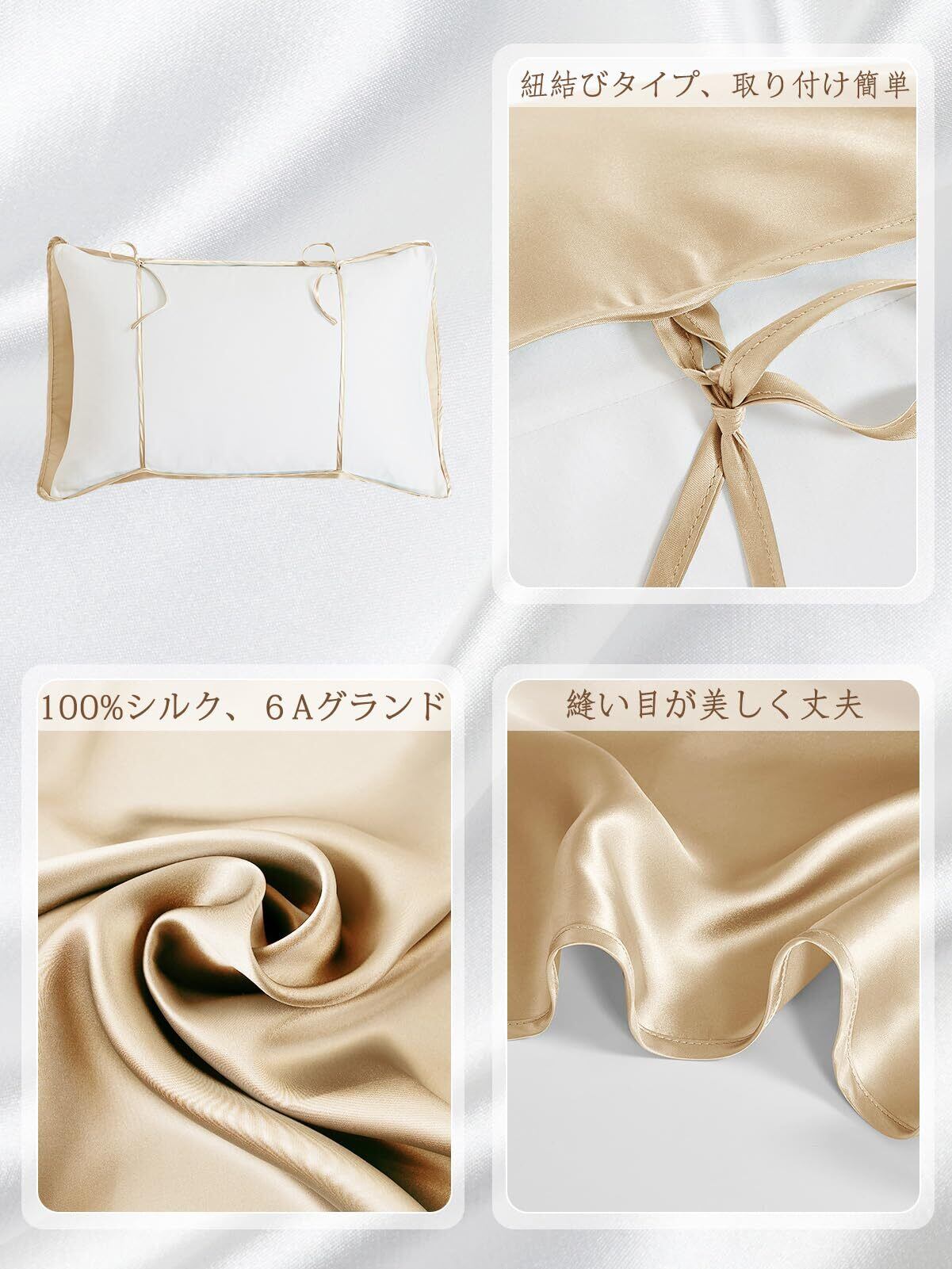 [THXSILK] 枕カバー シルク 無地ピローケース 片面シルク100% 紐結び 洗濯機可 最高グレード6A OEKO認証済み 30~50cm*50~75cmの枕適用 多様な形状の枕適用 旅行・出張・キャンプ 摩擦軽減 美髪・美肌 寝癖軽減 ギフト 贈り物 四季適応 一枚(ゴールド 53*75cm)