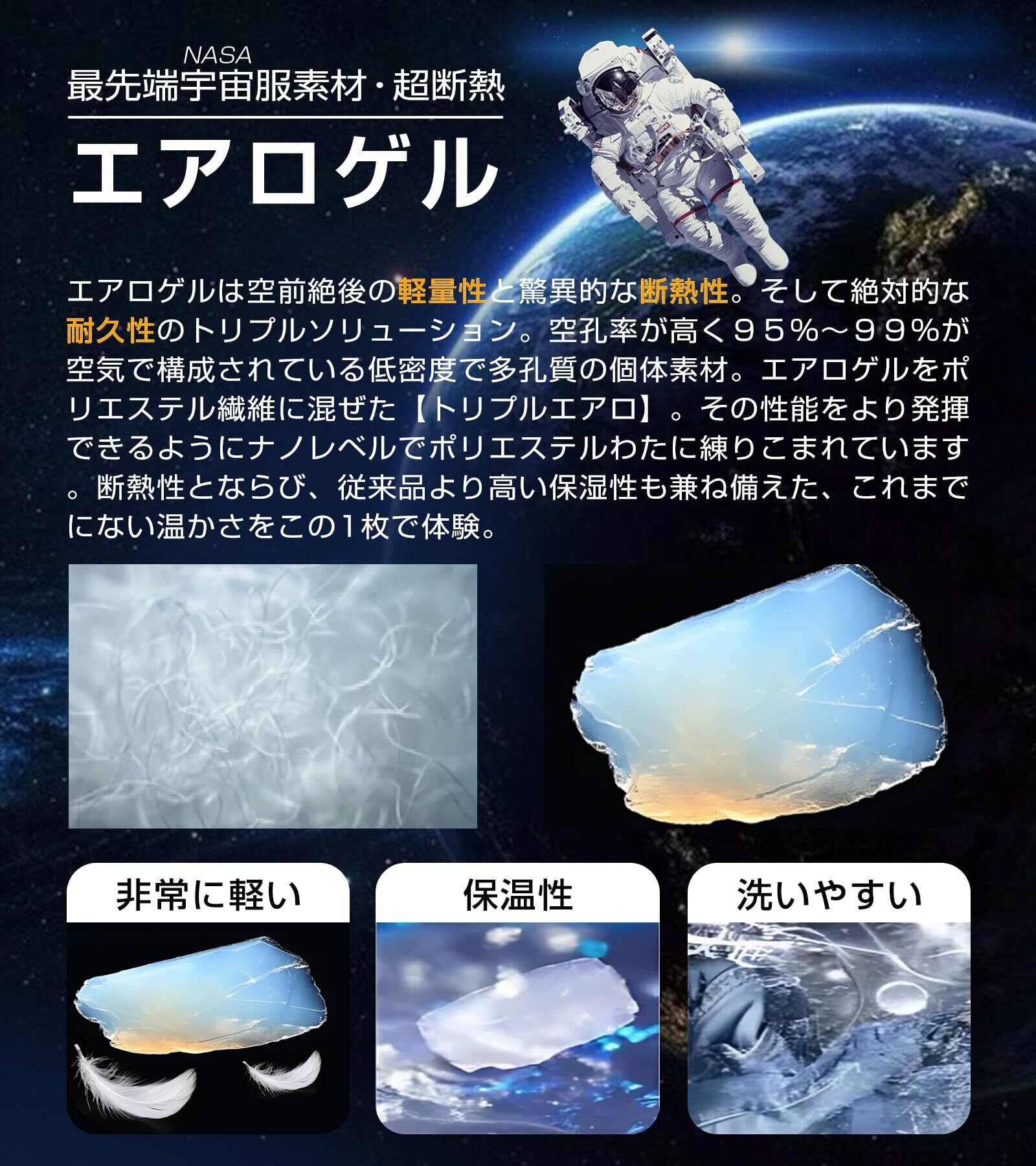 【コーヒー炭素繊維×宇宙服素材エアロゲル】の冬用敷きパッドは中綿が「次世代の夢のような素材」と言われる環境にやさしいコーヒーファイバーを使用。エアロゲルは空前絶後の軽量性と驚異的な断熱性、そして絶対的な耐久性のトリプルソリューション。エアロゲルをポリエステル繊維に混ぜた「トリプルエアロ」。その性能をより発揮できるようにナノレベルでポリエステルわたに練りこまれています。断熱性とならび、従来品より高い保湿性も兼ね備えた、冷え込む毎日を、ぽかぽか、あったかーく過ごしましょう。