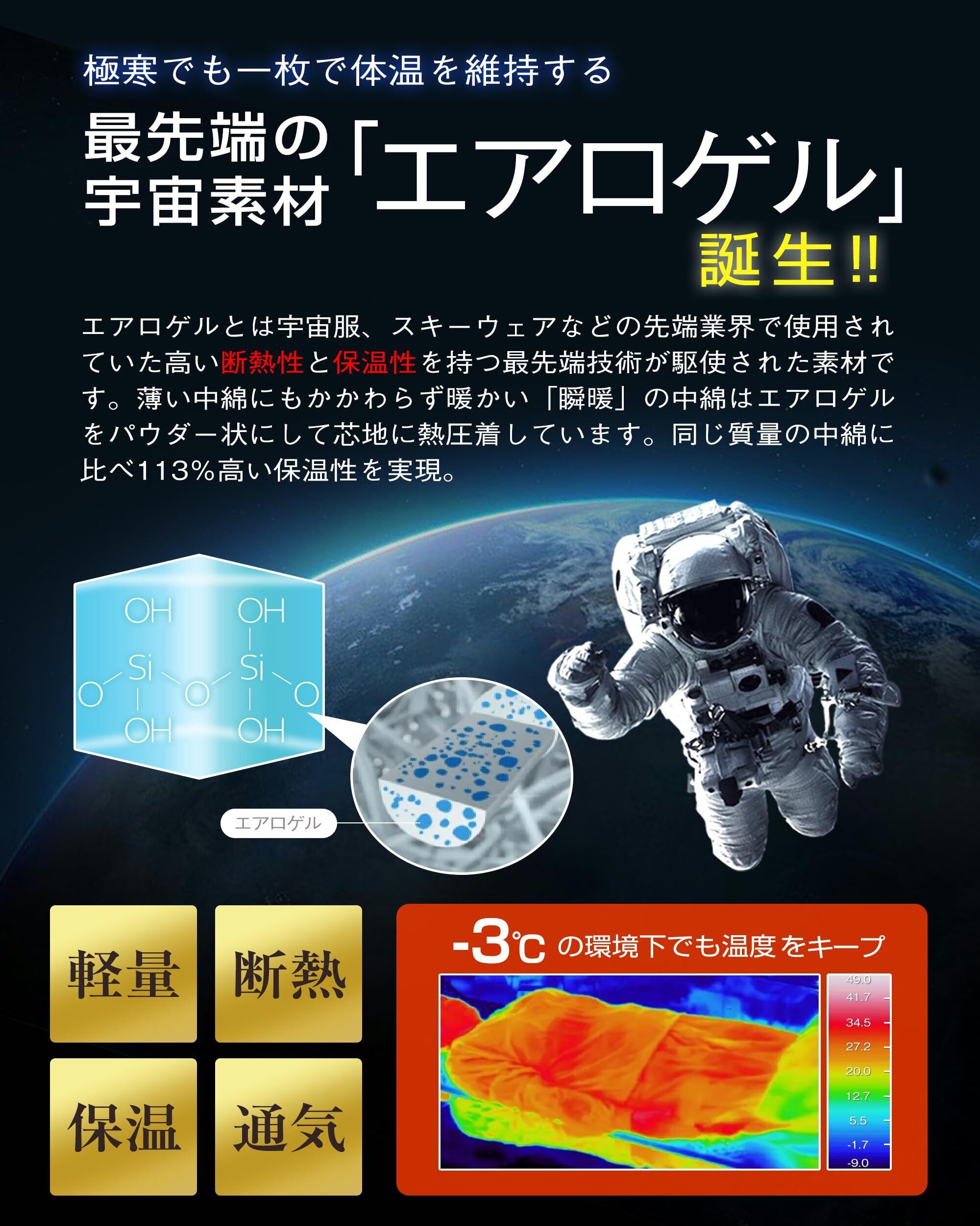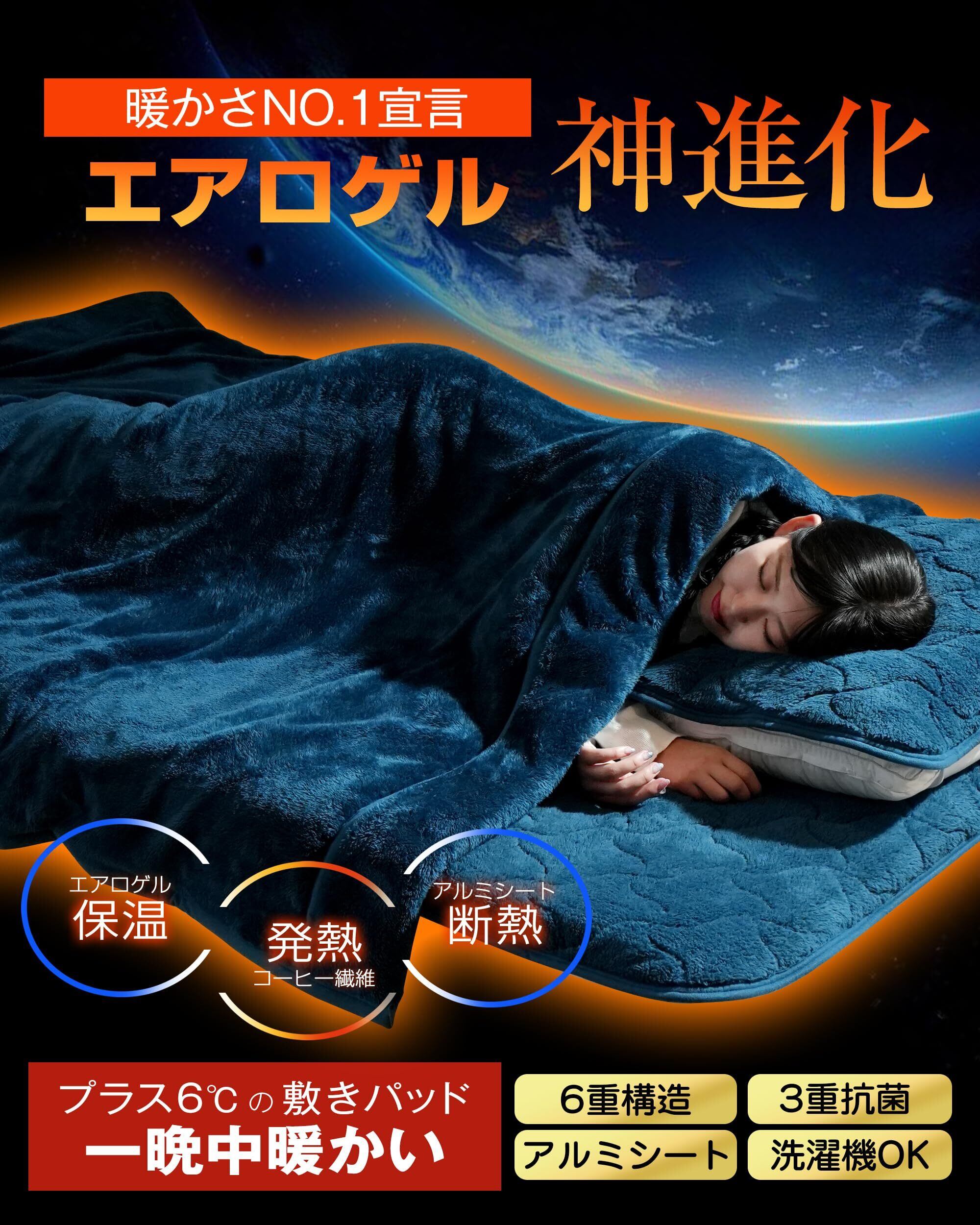 『2つの最先端テクノロジーで誕生、未来のあったか敷きパッド』「21世紀に革命を起こす素材」として知られる「エアロゲル」は、宇宙服にも使用されている圧倒的な「断熱性」「軽量性」「通気性」「柔軟性」「耐久性」を誇る素材です。また、「次世代の夢のような素材」と称されるコーヒーファイバーは、天然の「吸湿発熱」「蓄熱保温」「遠赤外発熱」「永久消臭」の特性を持ち、環境にもやさしい素材です。これら2つの最先端素材を冬用敷きパッドに使用し、究極の暖かさと快適さを実現しました。私たちにとっては小さな一歩かもしれませんが、寝具(敷きパッド)の世界にとっては大きな前進だと確信しています。ぜひ、"極みの一枚"を体験してみてください。