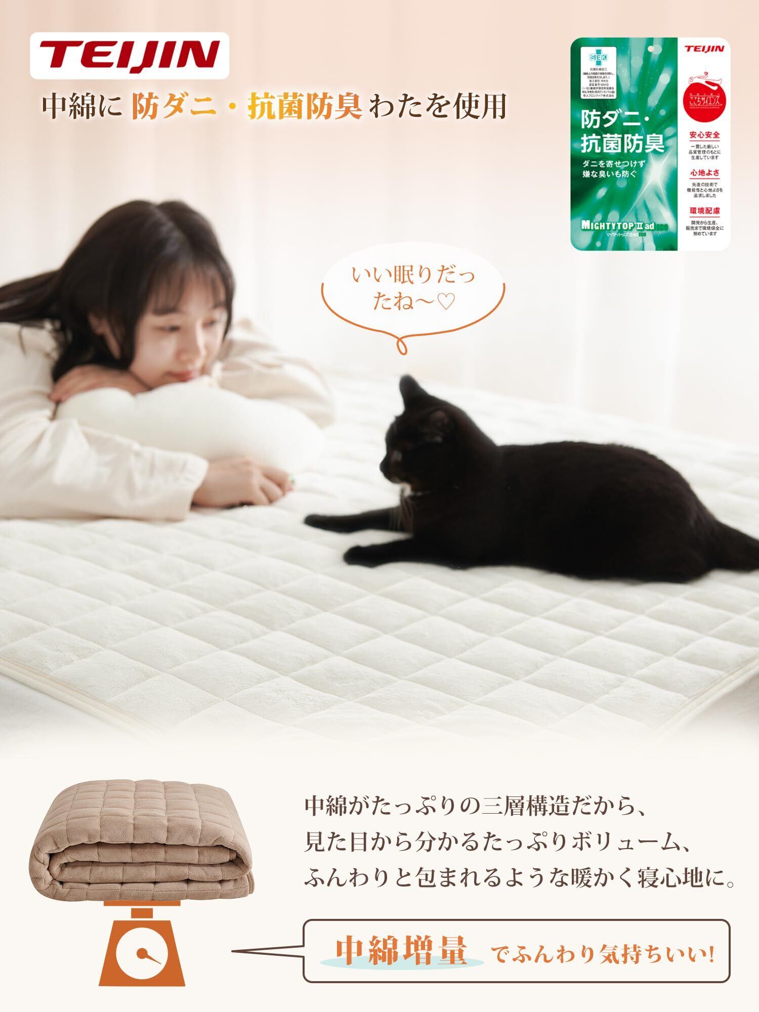 <帝人中綿>:中綿に防ダニ・抗菌防臭のTEIJIN綿を使用しているので、細菌の増殖を抑制し、イヤな臭いを防いで、アレルギーの体質の方にも適しています。