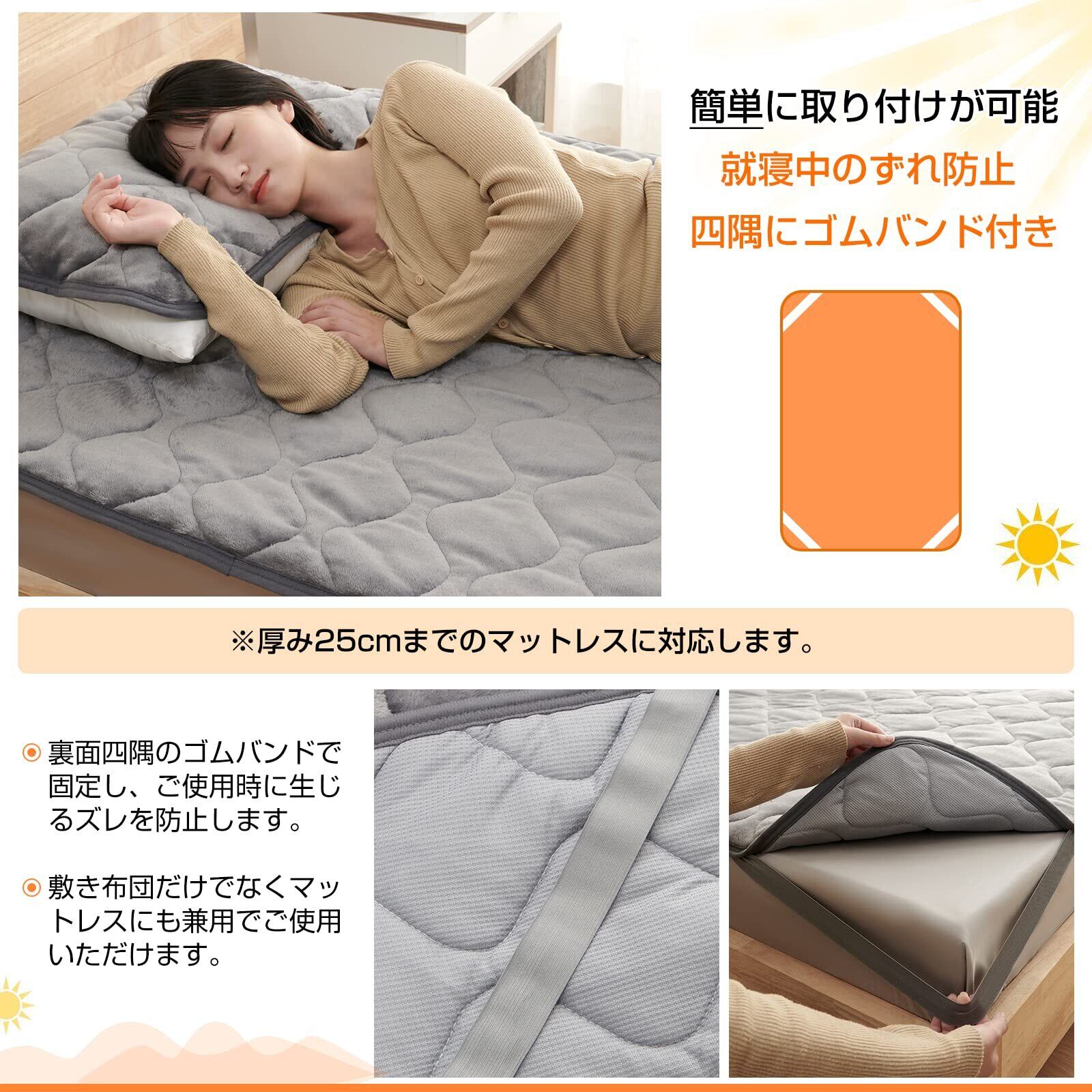 【四隅にゴムバンド付き】四隅にはズレ防止の強化ゴムバンド付きなので、寝返りでもずれにくく、使用中にズレるストレスを軽減します。ベッド/マットレス/敷き布団にしっかり固定して、朝まで安心してお休みいただけます。お手持ちの敷布団、ベッドマットレスに簡単に着脱、取り外しできます。