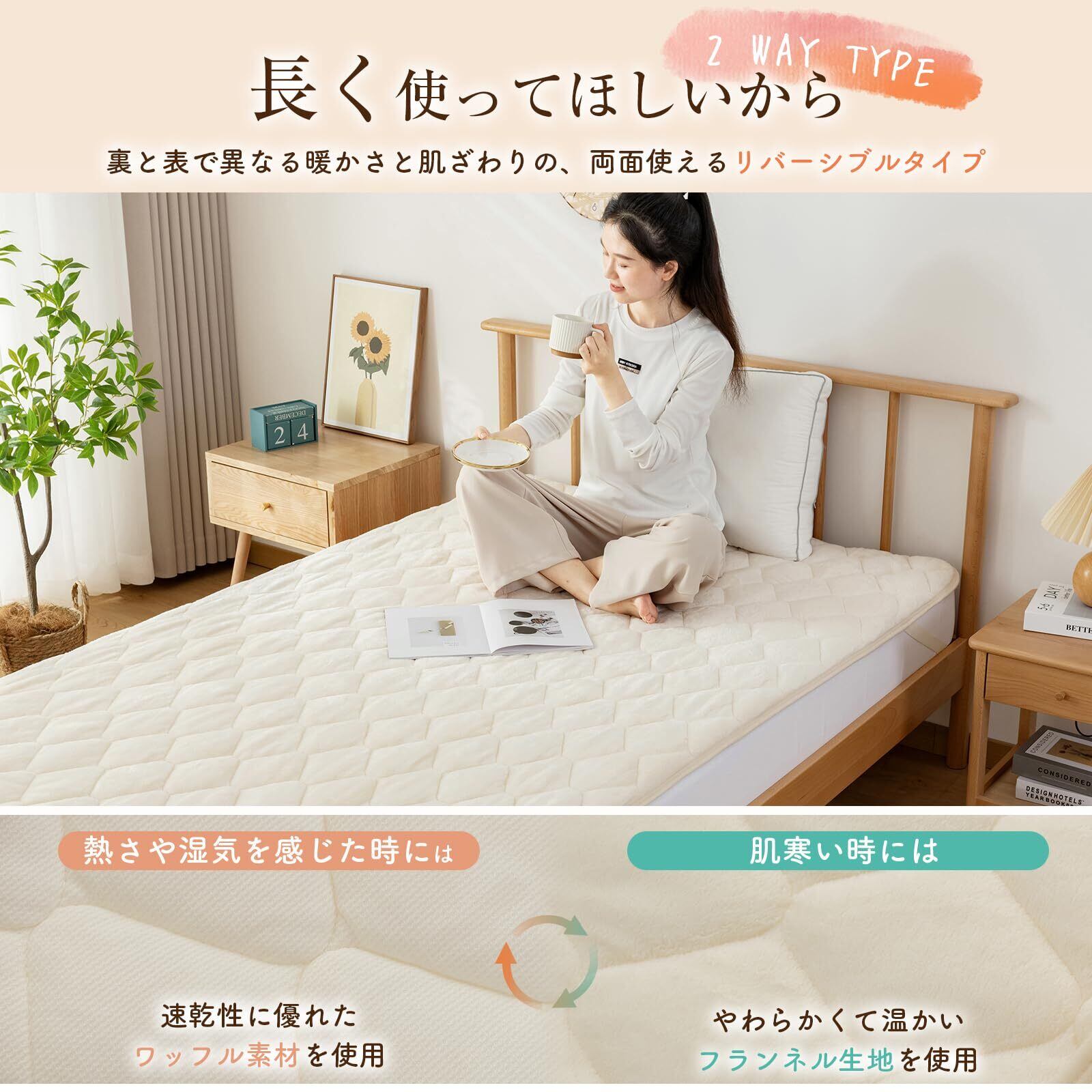 【肌にやさしい・リバーシブル】お肌に触れる部分が暖かくてやわらかいフランネル素材を採用し、クッション性と保温性に優れた中綿を充填して、ふんわり心地よい寝心地を実現しました。春秋にはサラッとしたワッフル側で使え、気候や気分に合わせて、表と裏を使い分けて1枚で快適に過ごせます!普通的なベッドパッドより通気性・吸湿性が高くて、柔らかさと反発性も優れています。