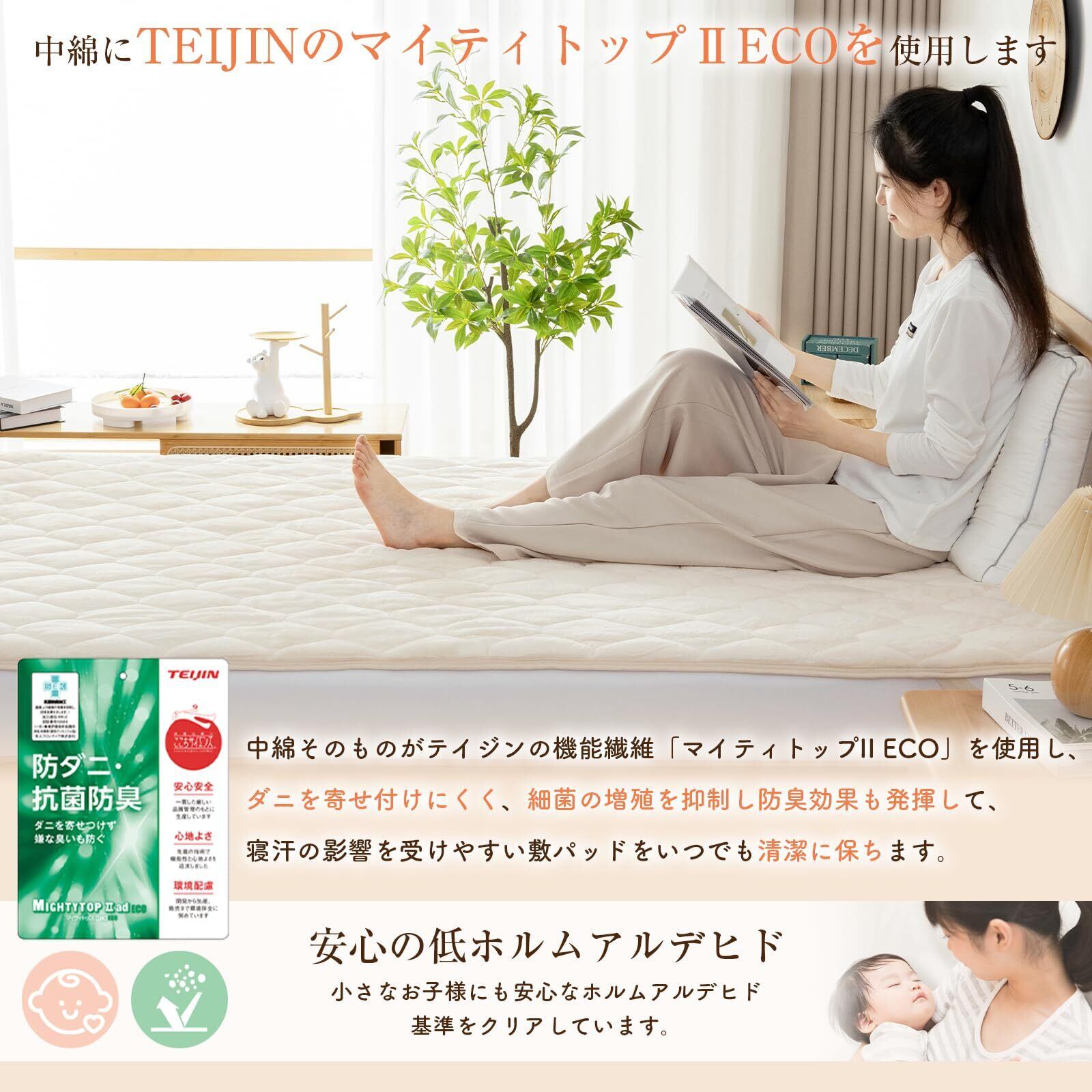 【TEIJIN(帝人)抗菌防臭シリーズ】抗菌防臭とは、主に動物や人間の皮脂や髪の毛に存在する「黄色ブドウ球菌」の繁殖を抑える効果のことです。中綿そのものが防ダニ機能を持っているのでダニを寄せ付けにくく、細菌の増殖を抑制し防臭効果も発揮します。嫌な臭いを防ぎ、寝汗の影響を受けやすい敷パッドを清潔に保ち、安心してお使いいただけます。