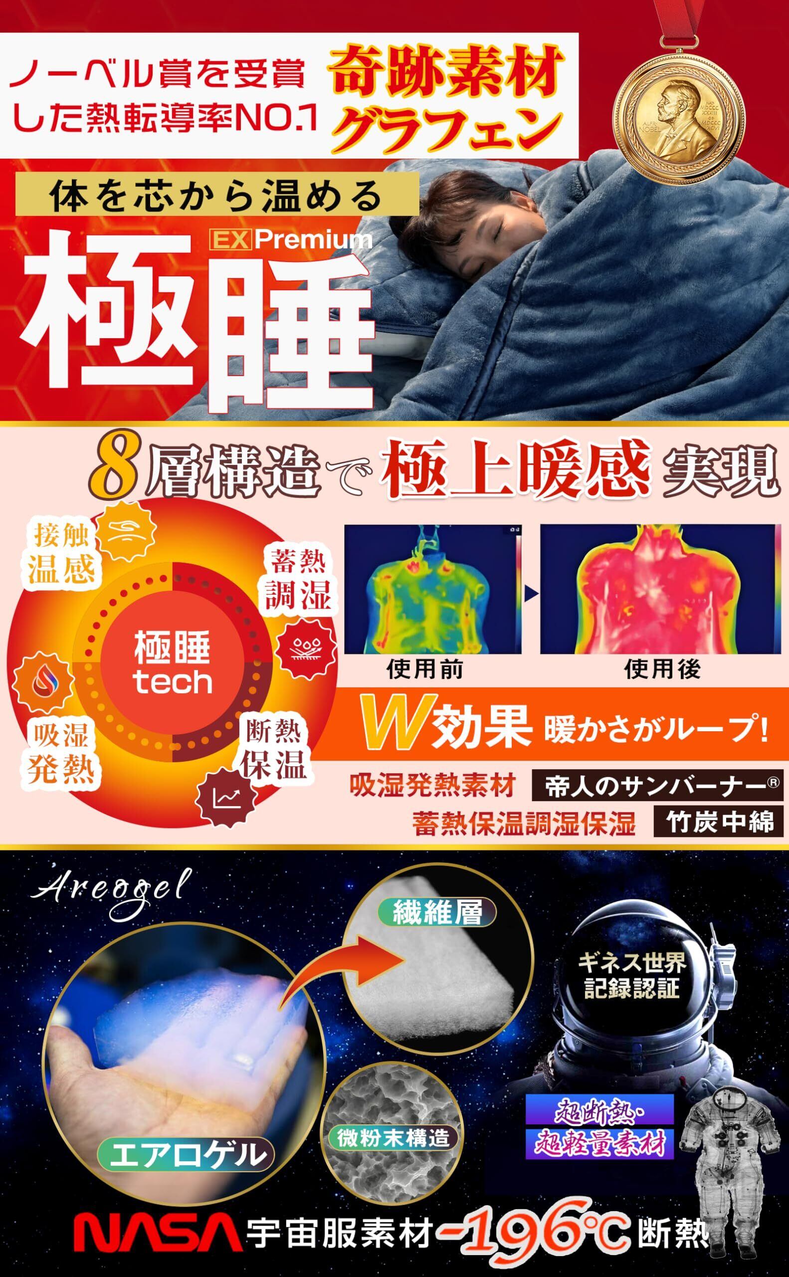 特徴 四重静電気防止【高機能導電糸】, 極上タッチ【最上位フランネル】, 極上暖感【吸湿発熱・W超断熱保温】, 極上睡眠【安眠・快眠】, 美容睡眠【CICA保湿・美肌】