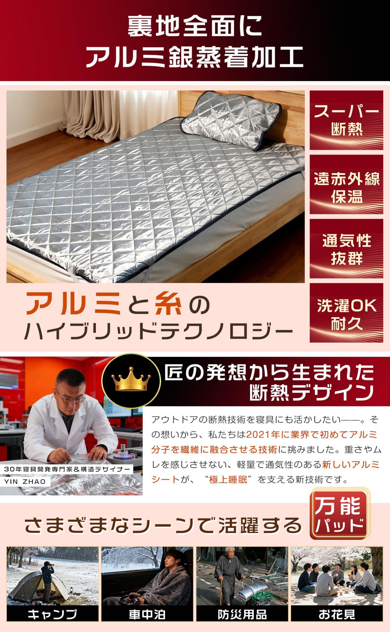 【W超断熱保温:高分子アルミ+エアロゲル繊維】一般的なあったか敷きパッドは中層にアルミシートを追加していますが、洗濯後に破片化して目に見えなくなり、断熱保温性能が失われることがよくありますが、本製品は宇宙服級のエアロゲル繊維と高分子アルミ蒸着加工を採用したW断熱構造を搭載。耐久性のある銀色裏地が一目瞭然で、冷気を高分子レベルで遮断し、内部の熱と肌の温もりを長時間維持。従来の「五層保温」「六層構造」とは一線を画す、画期的な断熱保温性能を実現しました。冬の寝室はもちろん、アウトドアキャンプでも最高の暖かさをお楽しみいただけます。