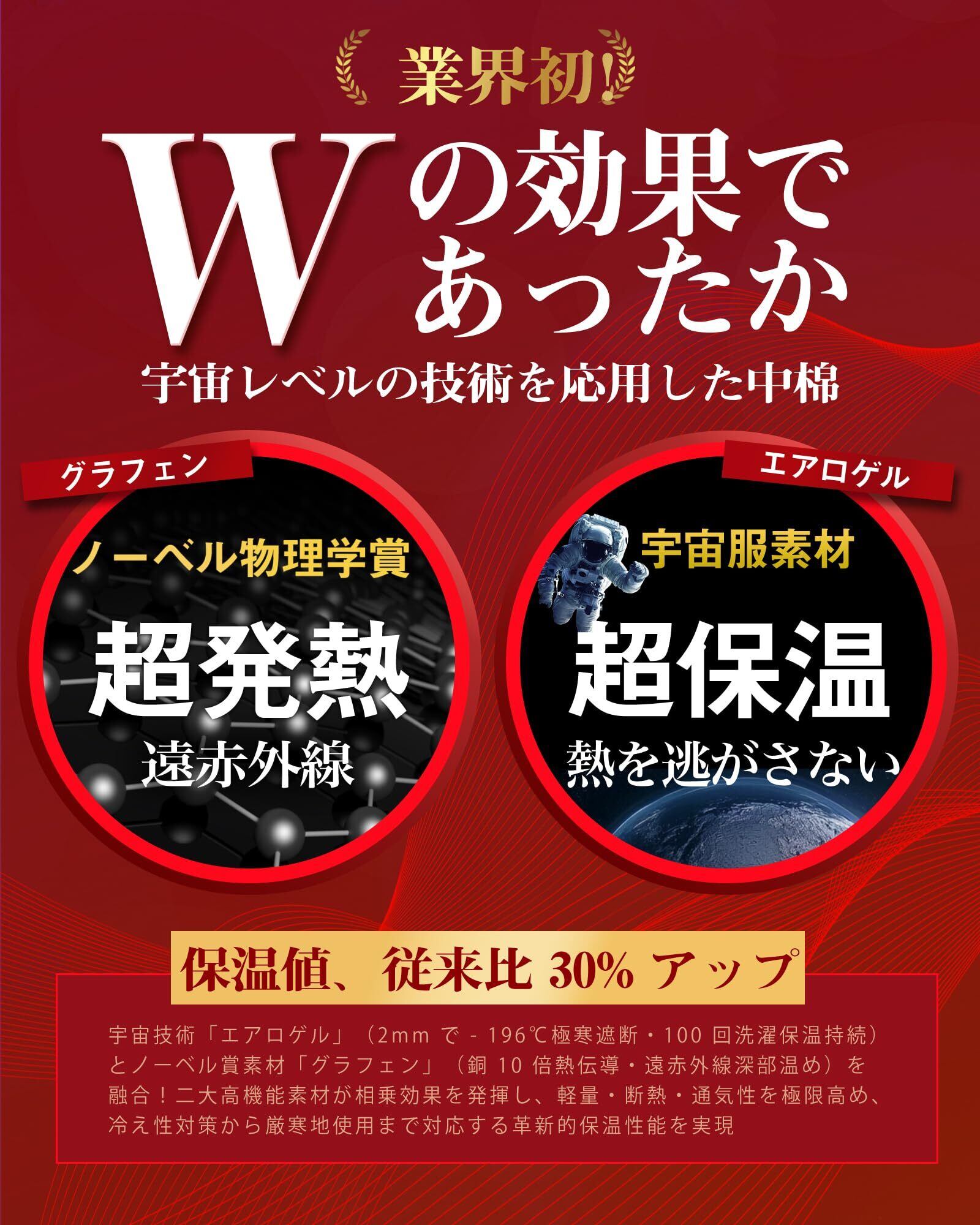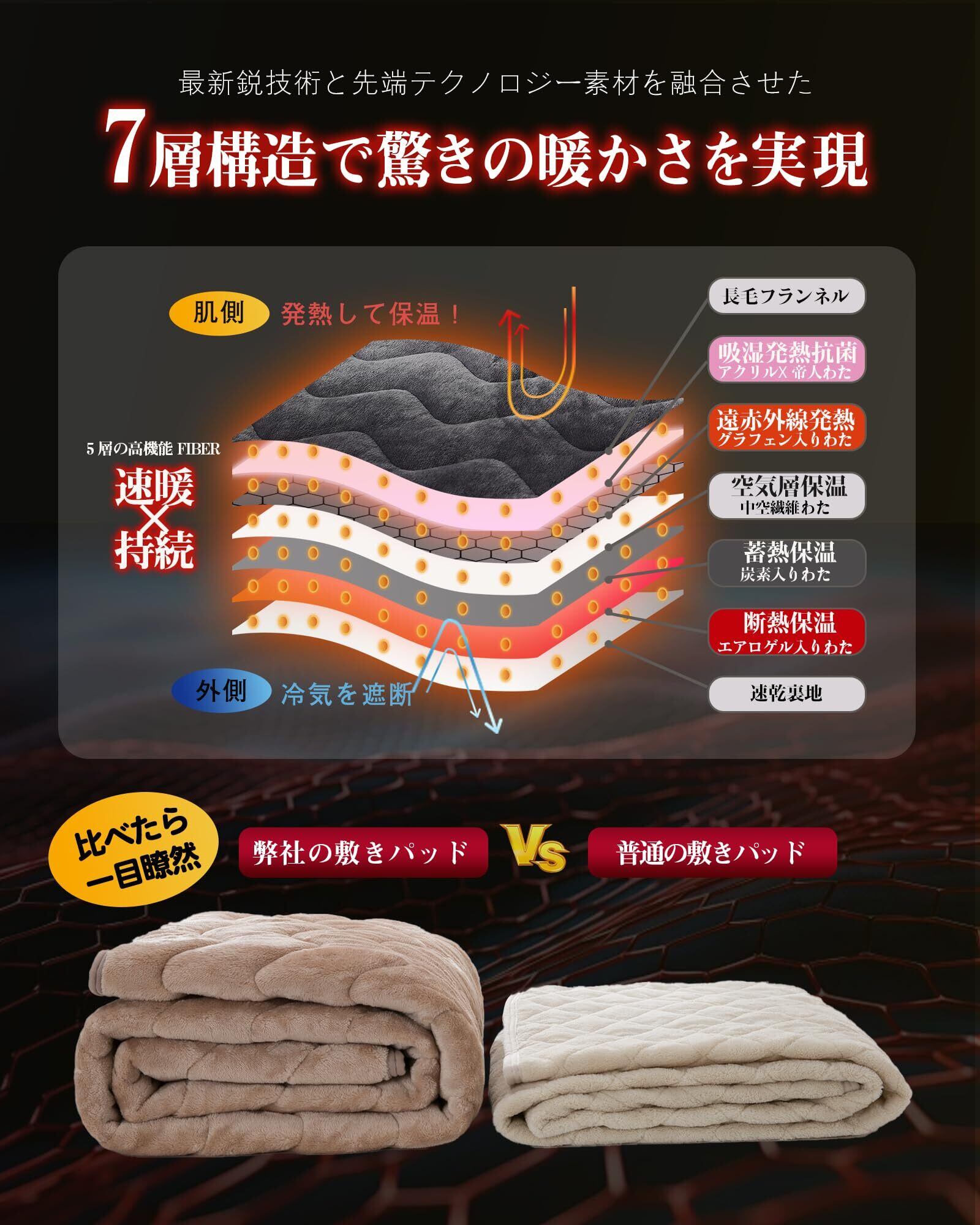 【グラフェン × エアロゲル 二重先端技術の融合】宇宙技術「エアロゲル」は厚さ 2mm で - 196℃の極寒を遮断する超軽量断熱材です。微細な空気層が外気を遮りながら内部の熱を保持し、洗濯を 100 回繰り返してもその保温性能は持続します。一方、ノーベル賞素材「グラフェン」は、銅の約 10 倍の熱伝導率を誇り、体の熱エネルギーを遠赤外線へと変換し、深部からやさしく温めます。この二大素材が相乗効果を発揮することで、当該冬用敷きパッドの軽量性・断熱性・通気性を極限まで高め、これまでにない持続的な保温性を実現しました。冷え性対策はもちろん、厳寒地での使用にも十分対応できる性能を備えています。