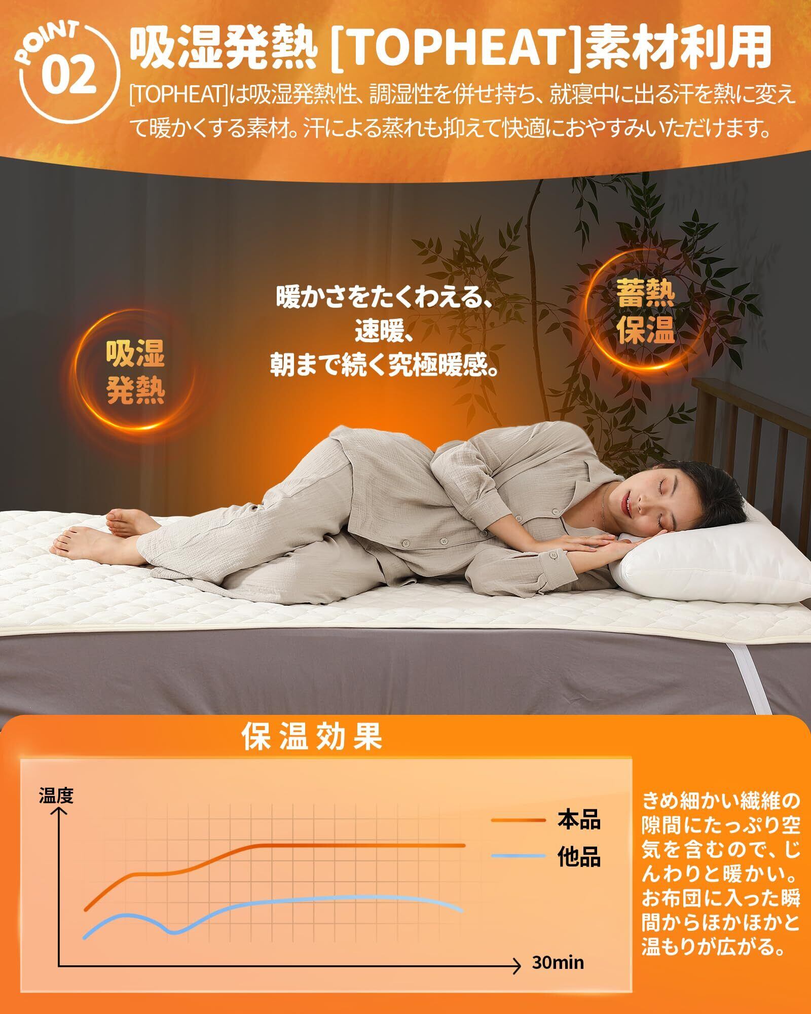 【吸湿発熱素材「TOPHEAT」使用】「TOPHEAT」は、吸湿発熱性と調湿性を兼ね備えた高機能素材。就寝中に出る汗を熱に変えてあたたかさを生み出し、さらに蒸れを抑えて快適な眠りをサポートします。きめ細かな繊維がたっぷりと空気を含み、じんわりと体を包み込むぬくもり。お布団に入った瞬間から、ぽかぽかの暖かさを実感できます。