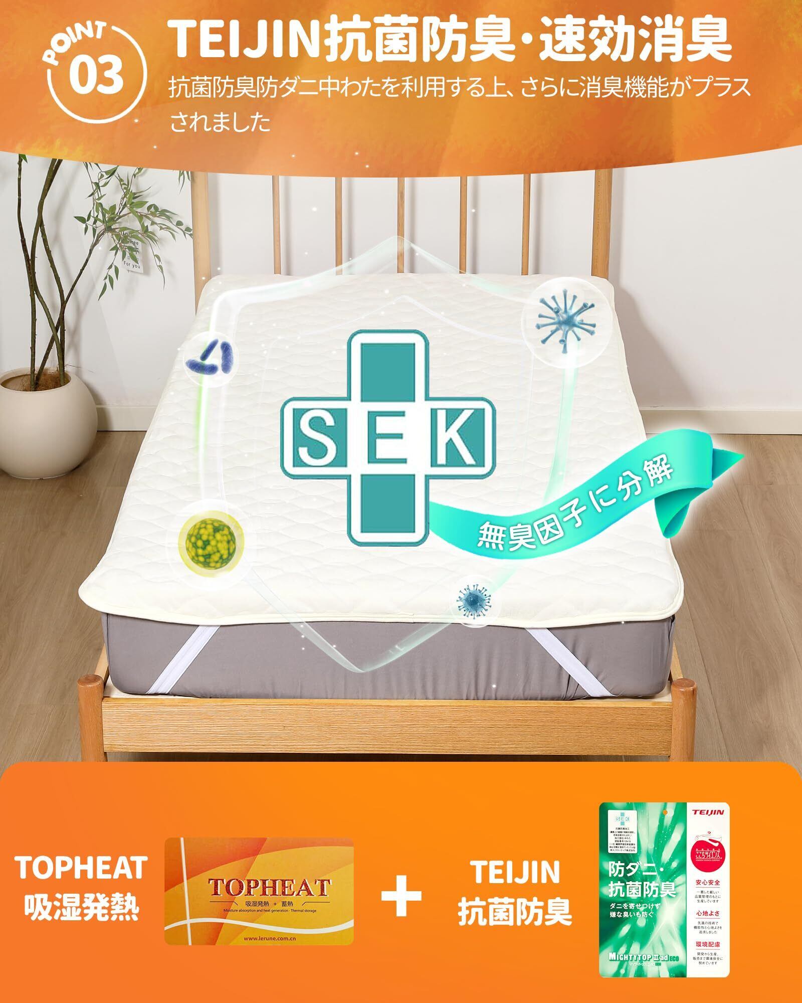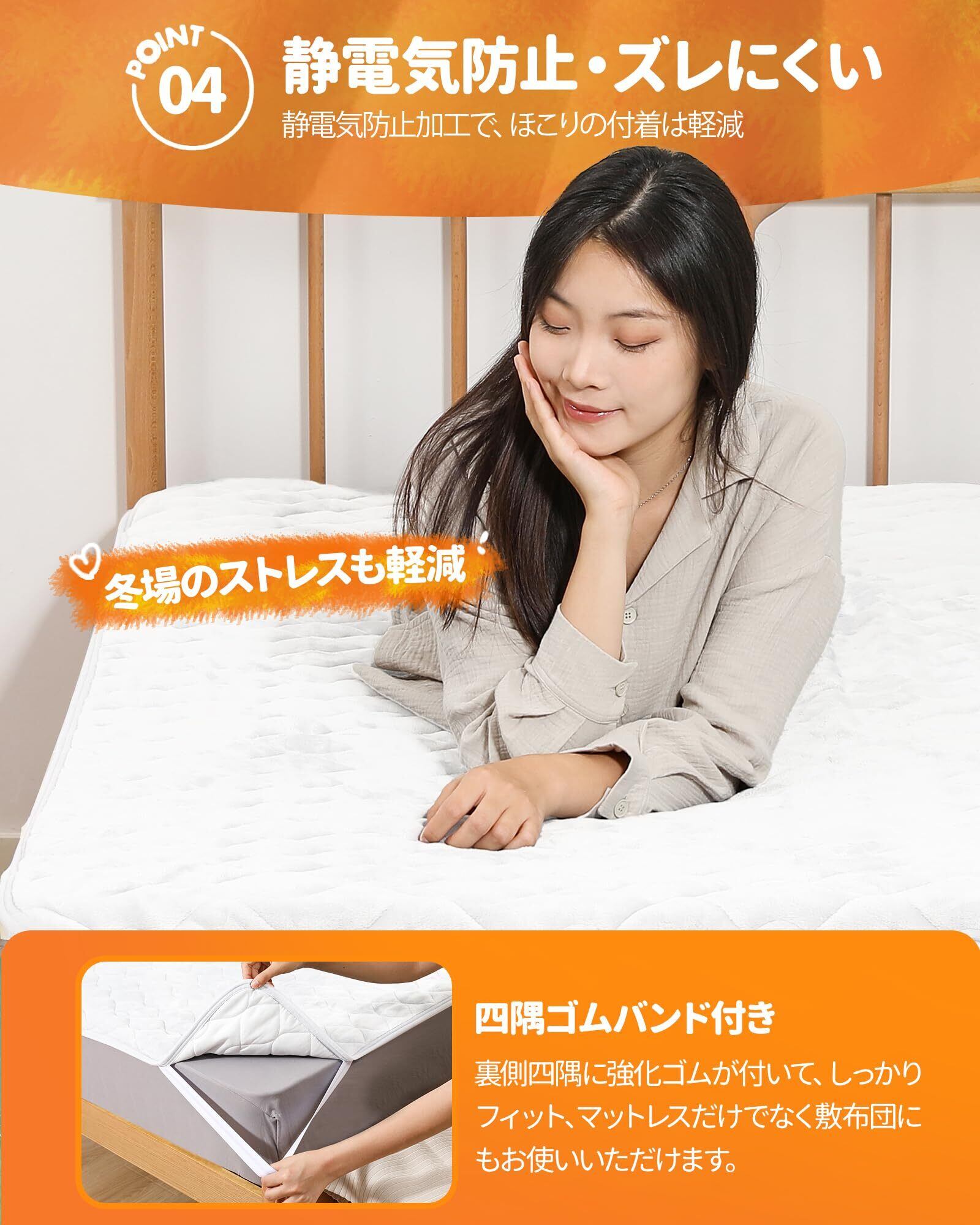 【強化ゴムバンド付きでズレ防止】【丸洗いOK】【品質サポート】①四隅にしっかり固定できる強化ゴムバンド付き。寝返りをしてもズレにくく、着脱も簡単です。厚さ約25cmまでのマットレスや敷き布団に対応。さらに軽量でコンパクトにまとまるので、収納やお手入れもラクラク。②ご家庭の洗濯機で簡単にお手入れでき、いつでも清潔&ふわふわの使い心地。※洗濯の際は洗濯ネットをご使用ください。※乾燥機のご使用はお避けください。