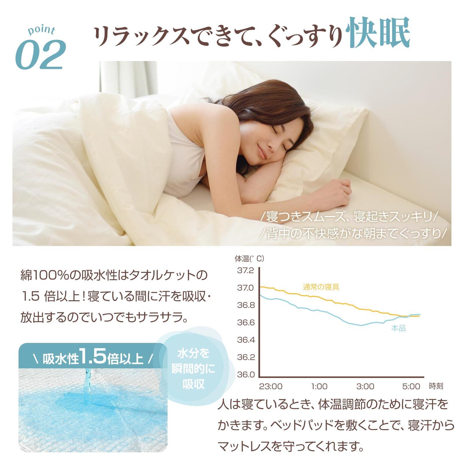 【敷きパッド・商品情報】サイズ:シングル・100x200cm;表地:天然素材綿100%;中綿:ポリエステル・抗菌防臭帝人(TEIJIN)綿含み【中棉約160g/㎡】;裏地:ポリエステル100%;仕様:四隅ゴムバンド付き。【天然素材・綿100%】直接肌に触れる天然素材の綿100%を採用