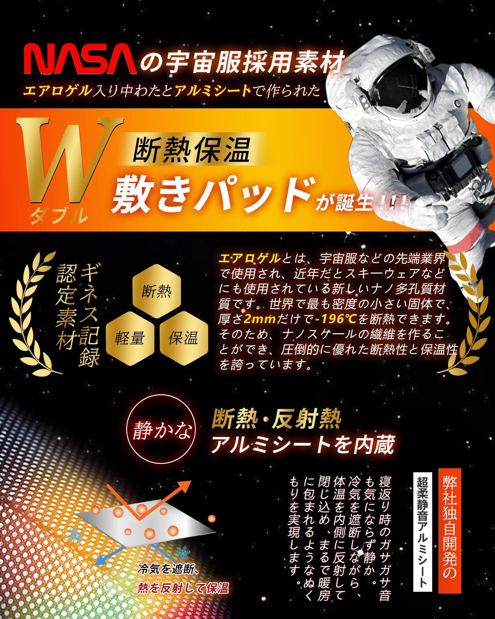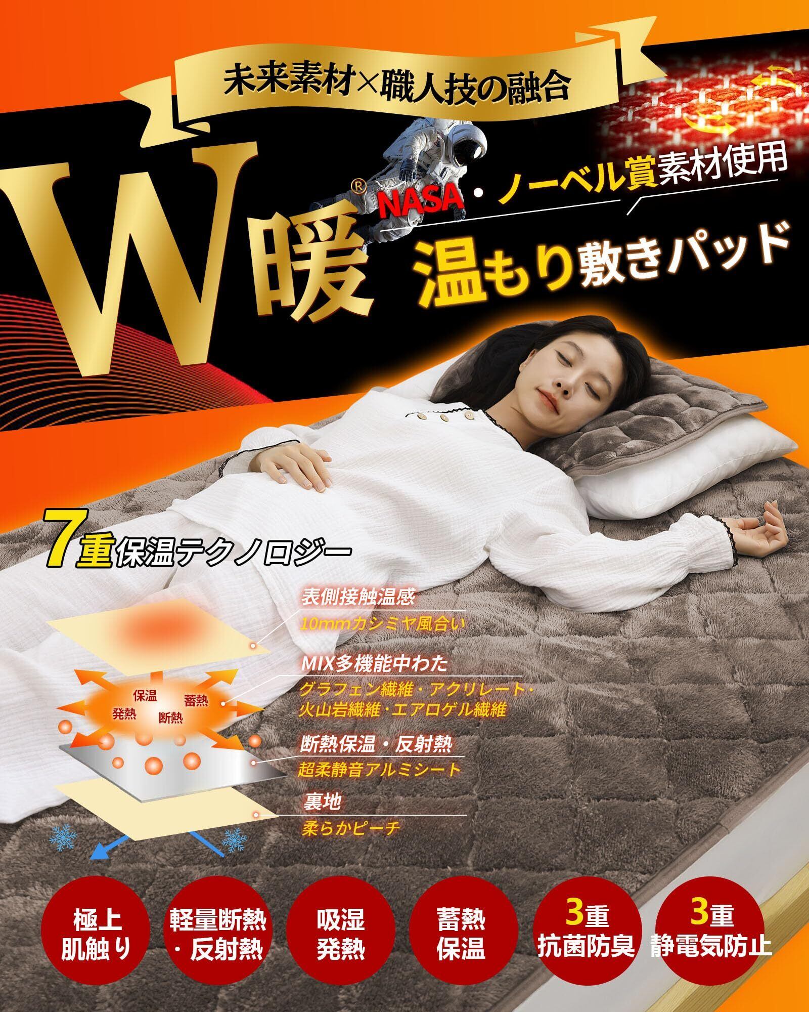 【NASA由来の断熱素材エアロゲル繊維で、宇宙級の断熱力】NASAの宇宙服にも採用されている超断熱素材「エアロゲル」を中綿に使用します。驚くほど軽く、断熱性に優れ、外気の冷たさをしっかりブロックします。敷パッド内の熱を逃さず、まるで熱を閉じ込めたカプセルのような感覚に。厳寒の夜でも、シーツに入った瞬間からぬくもりが持続し、全身を温め、朝まで快適な睡眠をサポートします。