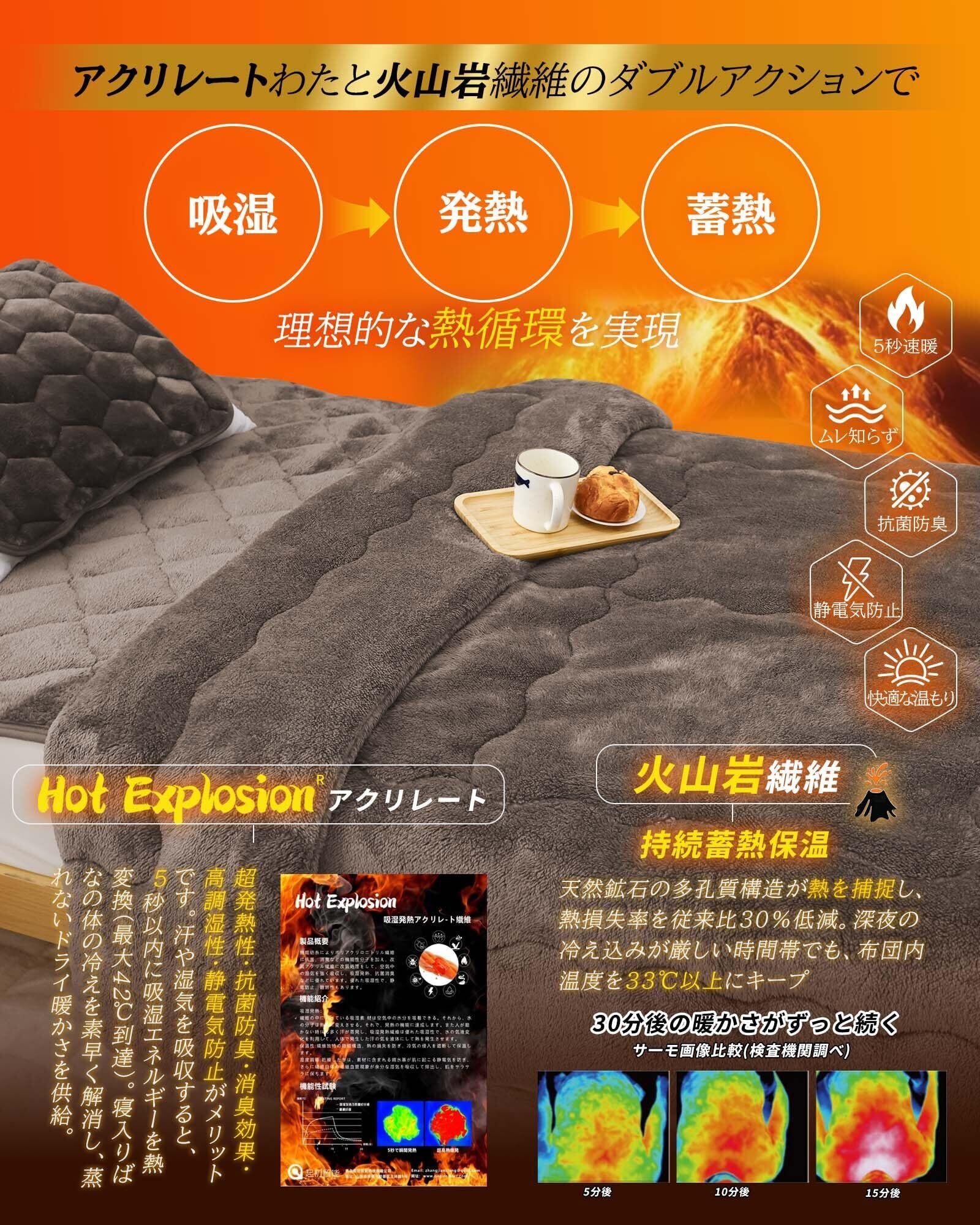 【アクリレート&火山岩繊維入り、速暖・蓄熱保温・快適に】この敷きパッドはHot explosionアクリレートわたを使用して、超発熱性・抗菌防臭・消臭効果・高調湿性がメリットです。汗など湿気を吸収し5秒に熱を発生、ムレ感のないドライな暖かさが広がります。さらに火山岩繊維は熱を捕らえ、敷きパッド内にしっかりと閉じ込めます。通常敷パッドと比べて、保温性が30%向上します。素材を上手に組み合わせ、しきぱっとの湿度の調整効果を最大に発揮し、蒸れを防ぎつつ、熱を蓄えて保温できます。