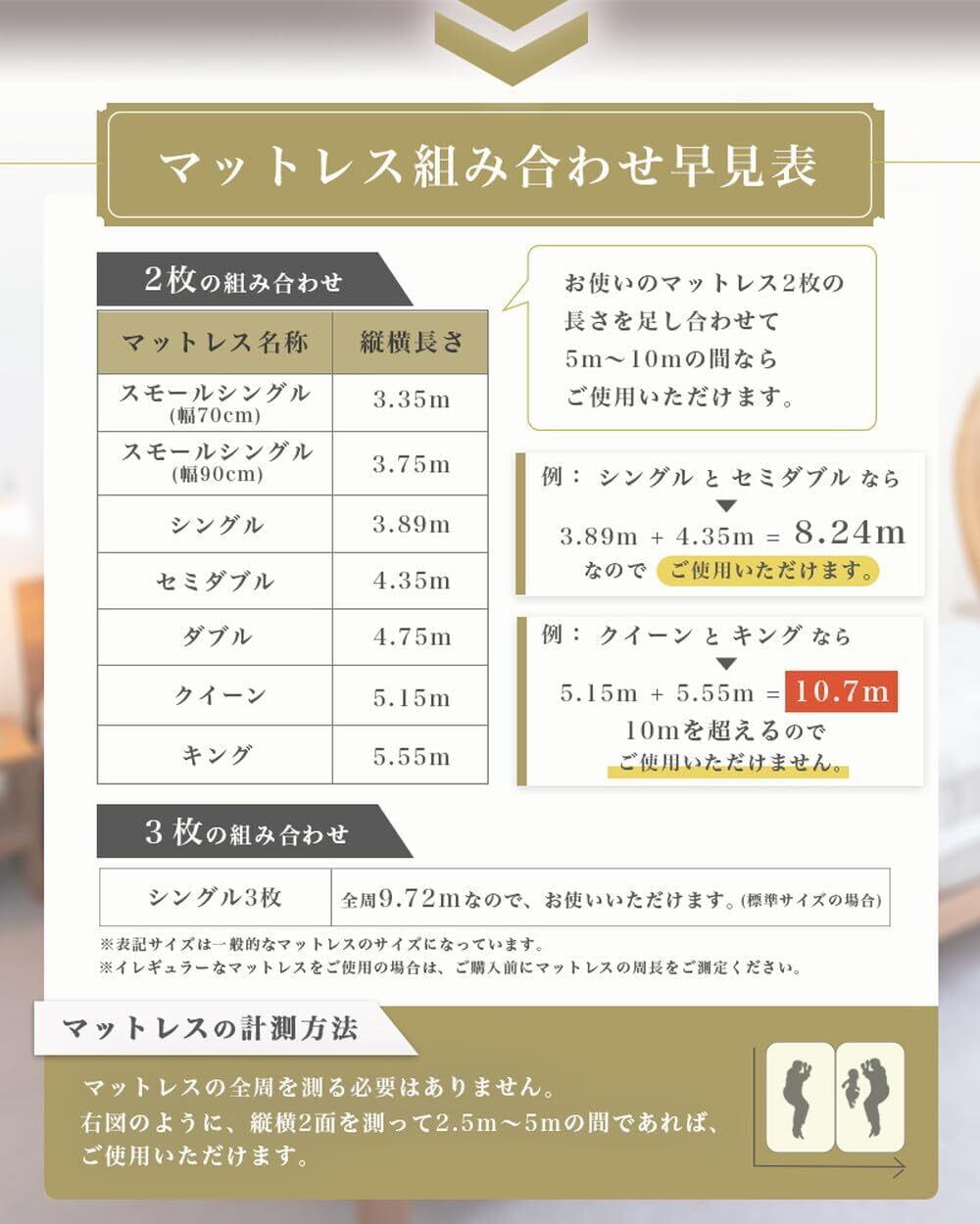 【超ロングサイズのマットレスバンドで、ダブルサイズマットレス2枚にも対応!】最小5m〜最大10mの超ロングタイプのマットレスバンドです。シングルマットレス2枚はもちろん、ダブルサイズマットレス2枚といった広々サイズ、シングル/セミダブル/ダブル/クイーンの組み合わせなど幅広いマットレスの連結に対応できるので大家族でも安心です。(組み合わせ表は商品画像をご覧ください。)
