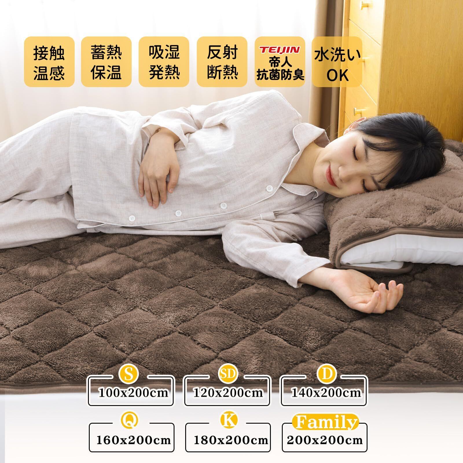 【こだわり多重保温】①「接触温感Q-MAX0.08」8mm ロングパイルマイクロファイバー②「吸湿発熱・保温蓄熱」アクリレートわた+TEIJIN抗菌防臭わた ③「熱を蓄え・保温」蓄熱わた④「冷気遮断」アルミシート ⑤「爽やか・耐久性」裏地リサイクルピーチ。寝ている間に、発熱・保温・断熱が繰り返されるため、寒い冬でも暖かさをキープできるしきぱっとです。