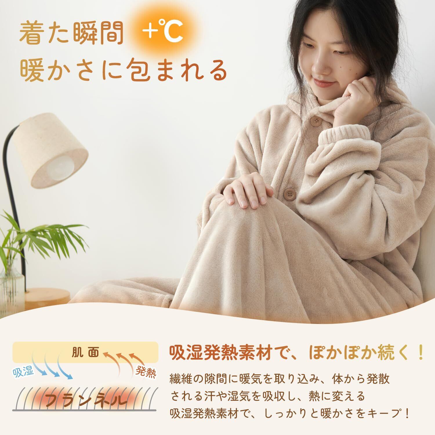 <様々なシーンで活躍>家中どこに居ても暖かく快適に着れる毛布、暖房費を節約したいときや朝の寝起きにとても便利です。リビングや寝室ではもちろん、軽量で動きやすいので、テレワークや家事にも最適。シンプルなデザインでちょっとした外出時のアウターとしてもご利用いただけます。