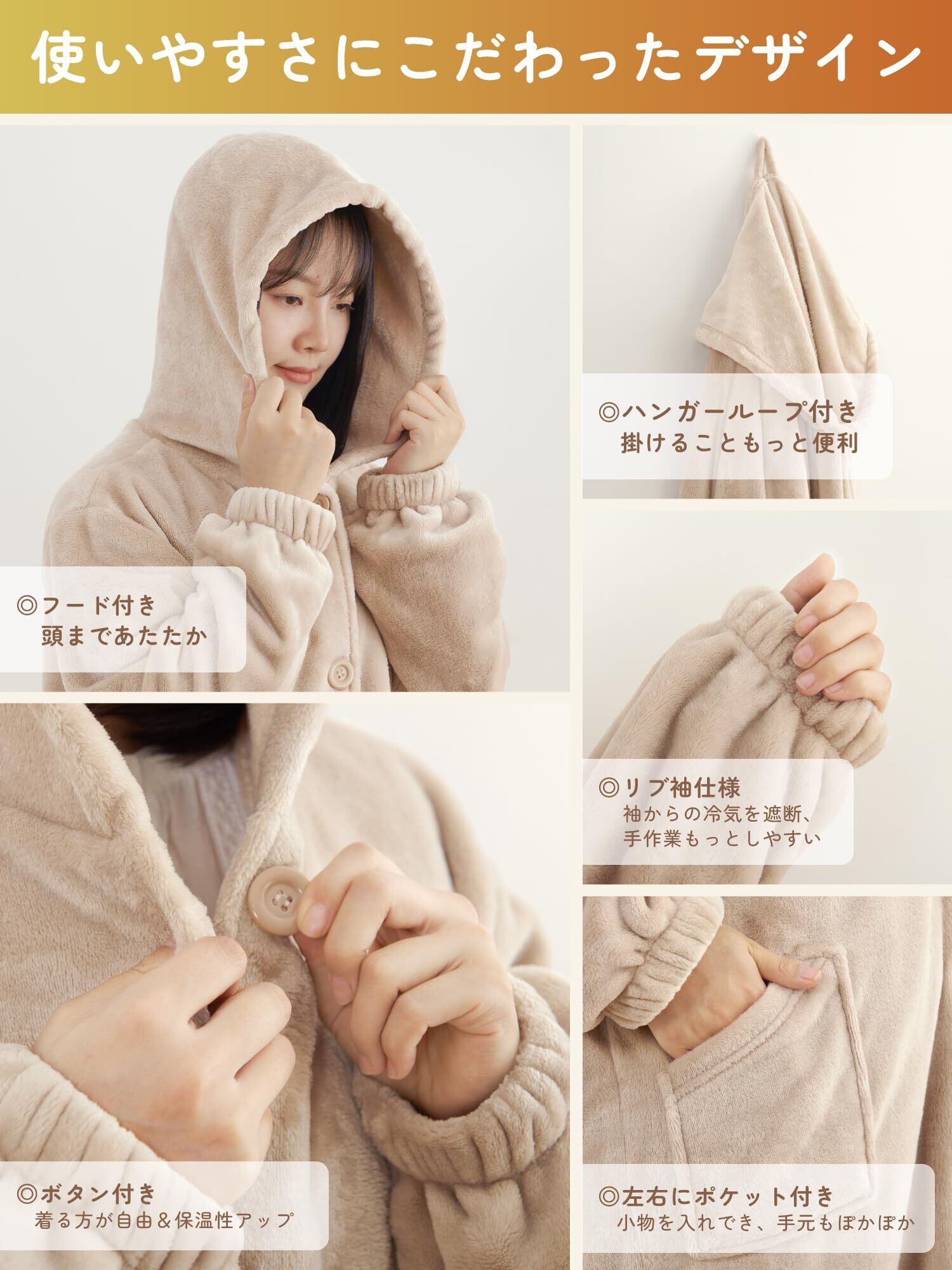 [WAYSHOME] 着る毛布 男女兼用 Mサイズ ルームウェア 暖かい 着るブランケット かいまき 部屋着 パジャマ ガウン フード付き ボタン付き ポケット付き リブ袖 フランネル ふわふわ 吸湿発熱 静電気防止 春用 秋冬 洗える レディース メンズ (M-着丈110cm,ベージュ)