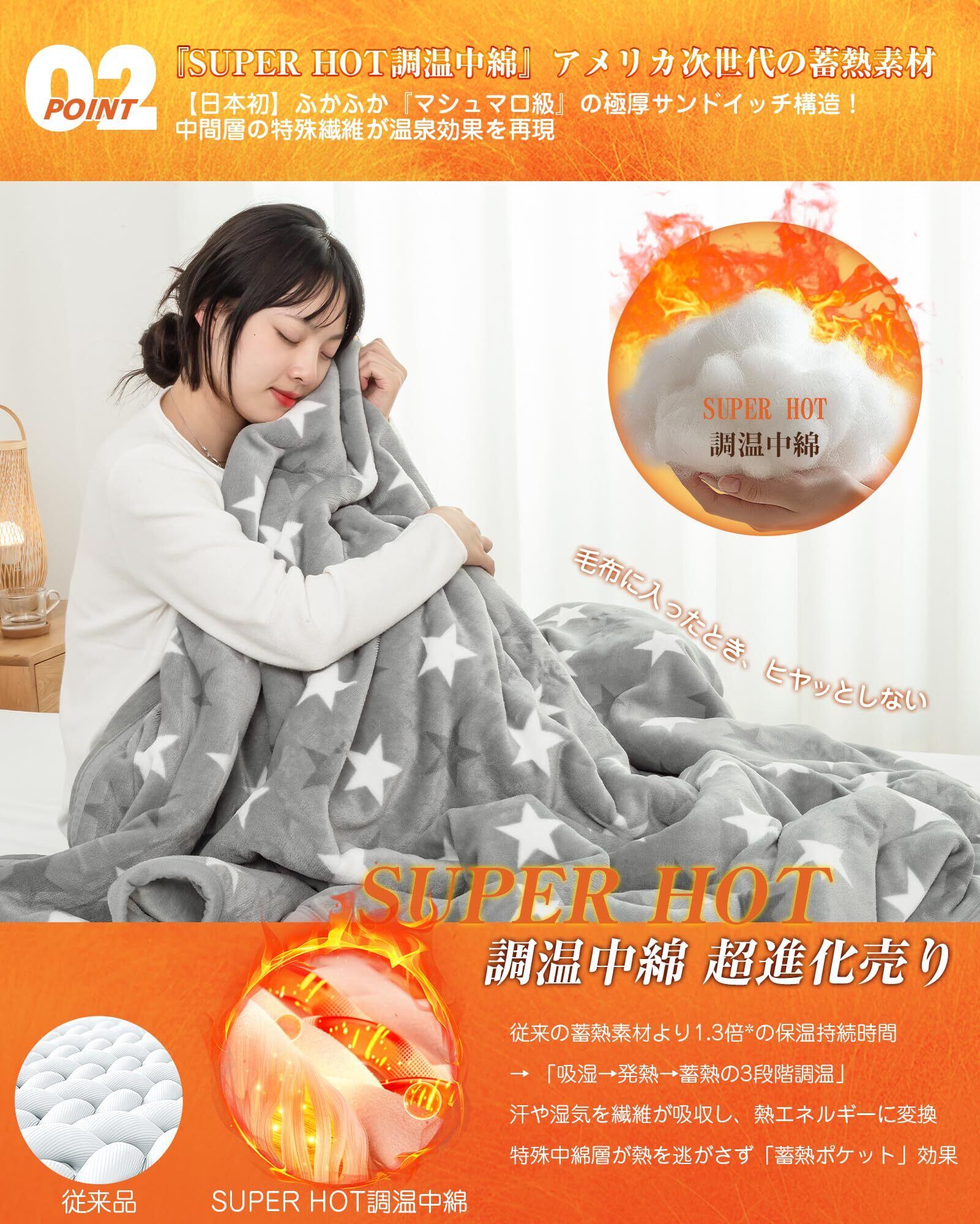 【未来の魔法瓶毛布・快適な温度が長~く続く!】①魔法瓶効果かつ瞬間超発熱の「扁平糸」超高密度フランネル+②VK Livingが独自に開発したSUPER HOT調温中綿+③保湿加工を施したフランネルで、2025年の新技術により創造したこだわりの魔法瓶毛布です。秋から春まで長期間使用でき、季節の変わり目にも重宝します。